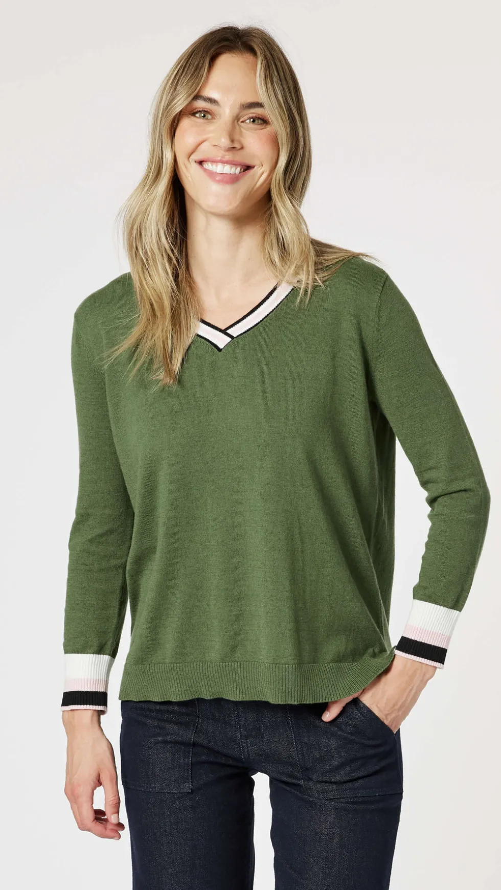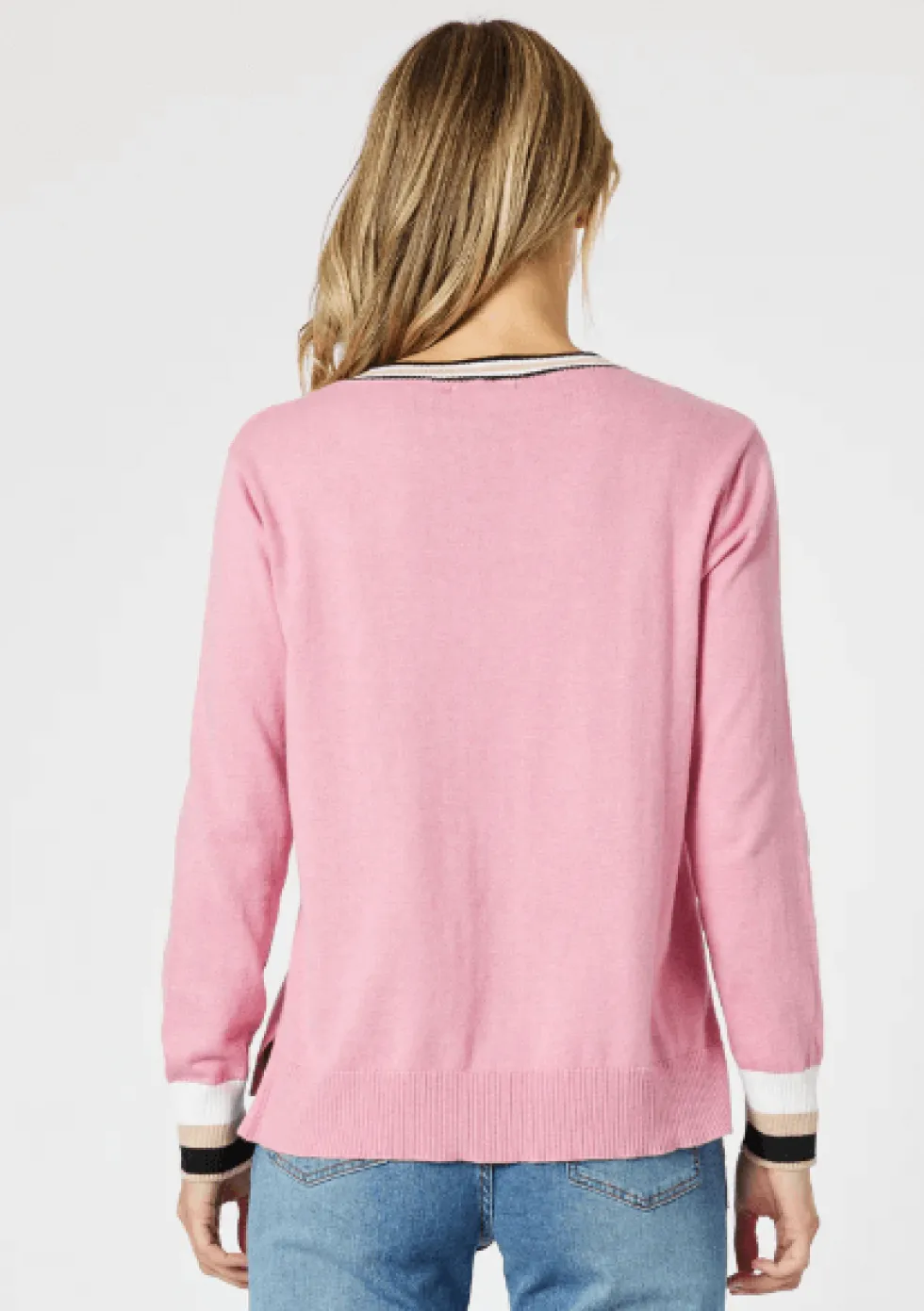Harvard Jumper – Blush46647 Gordon Smith at The Wardrobe. Our Harvard V Neck Jumper will soon become a staple piece in your wardrobe. With its classic v neck and long sleeve design, it's perfect for any occasion. Stylish stripe cuffs and neckline provide a touch of sophistication. Cotton/Nylon/Wool Sits on hip.