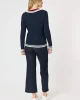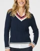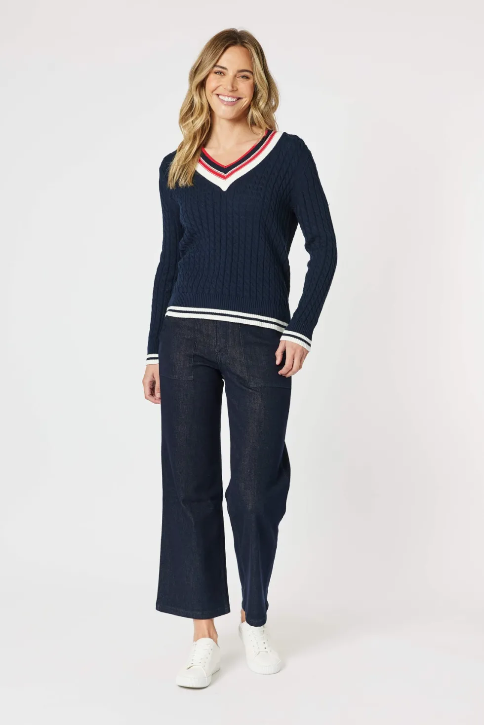 Oxford Cable Knit Jumper – Navy 46623 by Gordon Smith at The Wardrobe Crafted with a classic cable knit design and a flattering v-neck silhouette, our Oxford Cable Knit Jumper is a must-have for colder weather. The stripe design on the hem and neckline add a touch of style to this cosy jumper. Stay warm and stylish wit
