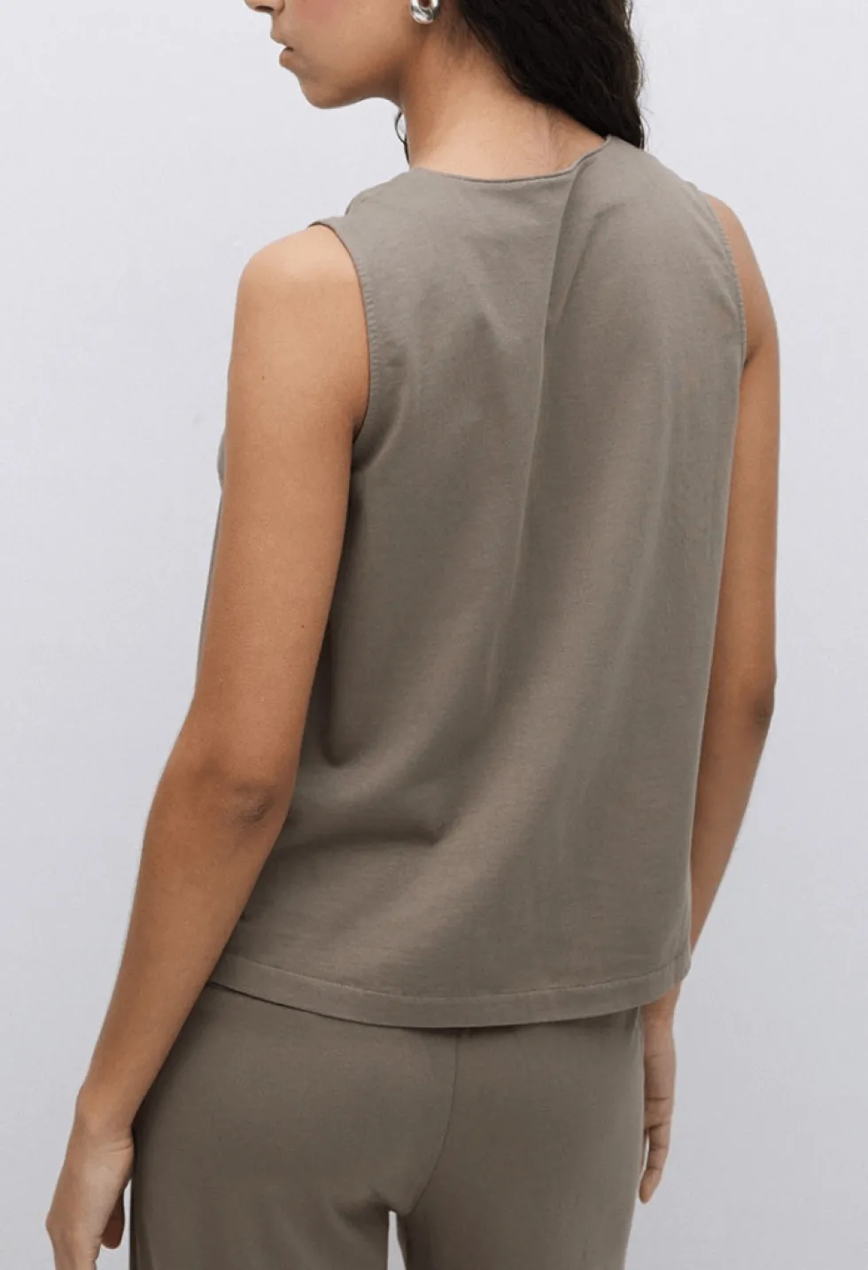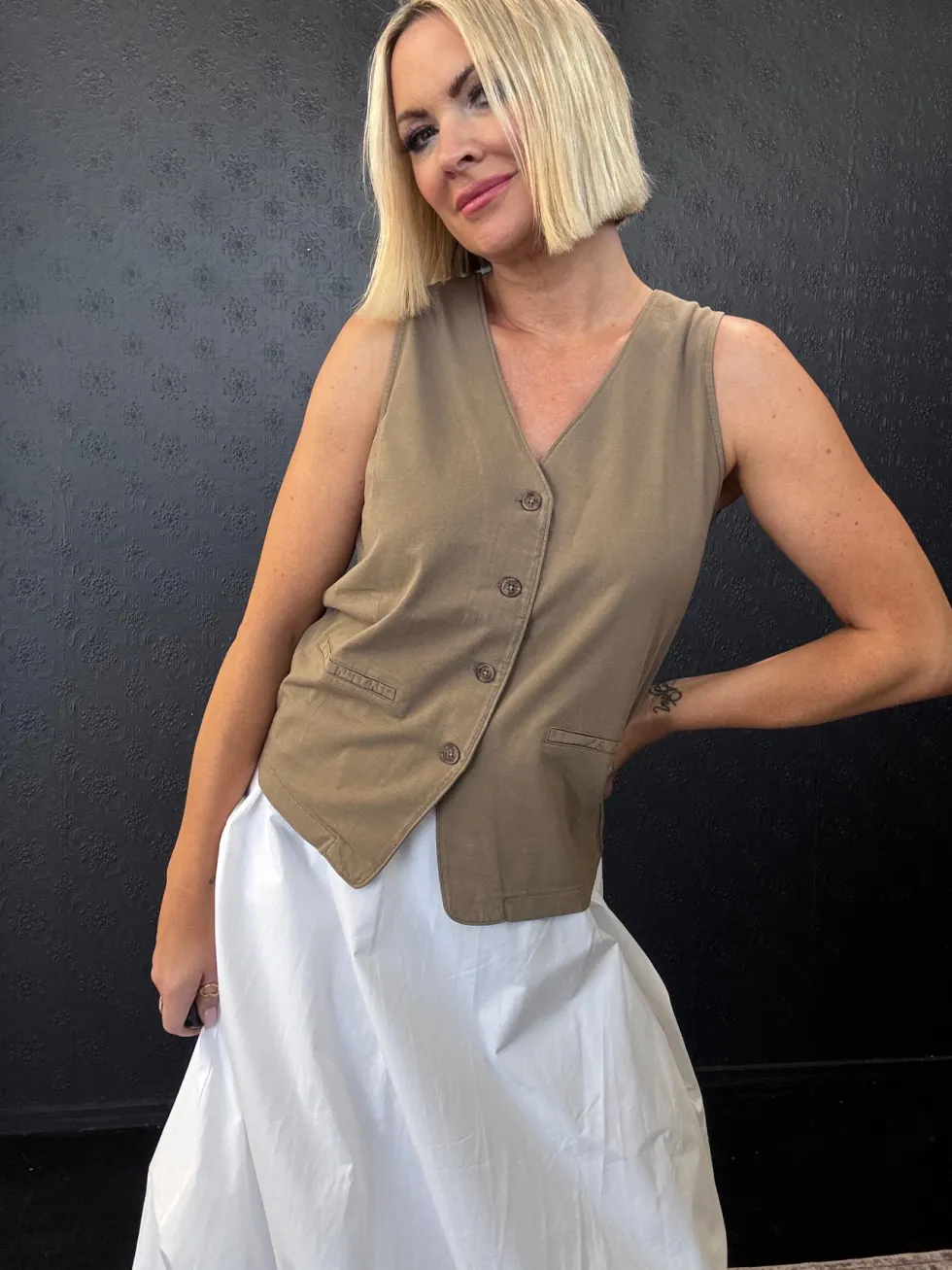 Khaki Cotton Knit Vest 42220 by Yerse at The Wardrobe. Flat-knit vest.100% cottonfabric. Straight cut. V-neck. Sleeveless. Tortoiseshell-effect button fastening. Trim pockets. Composition: 100% cotton. Model is 175 cm tall wearing size S. MATERIALS: Cottongarments are soft, breathable, absorbent and hypoallerge
