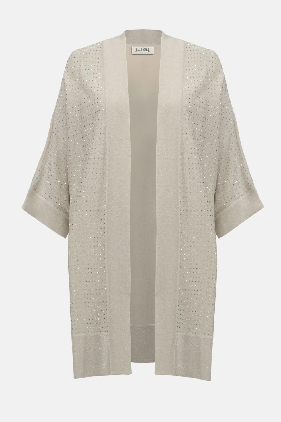 Sweater Knit Cover Up – Birch 254937 by Joseph Ribkoff at The Wardrobe. Crafted from soft sweater knit, this elegant cover-up receives a glamorous touch with shimmering iron-on detailing at the front. Its longline, open-front design and straight silhouette create a graceful, flowing look perfect for any occasion. 21% M