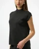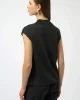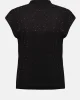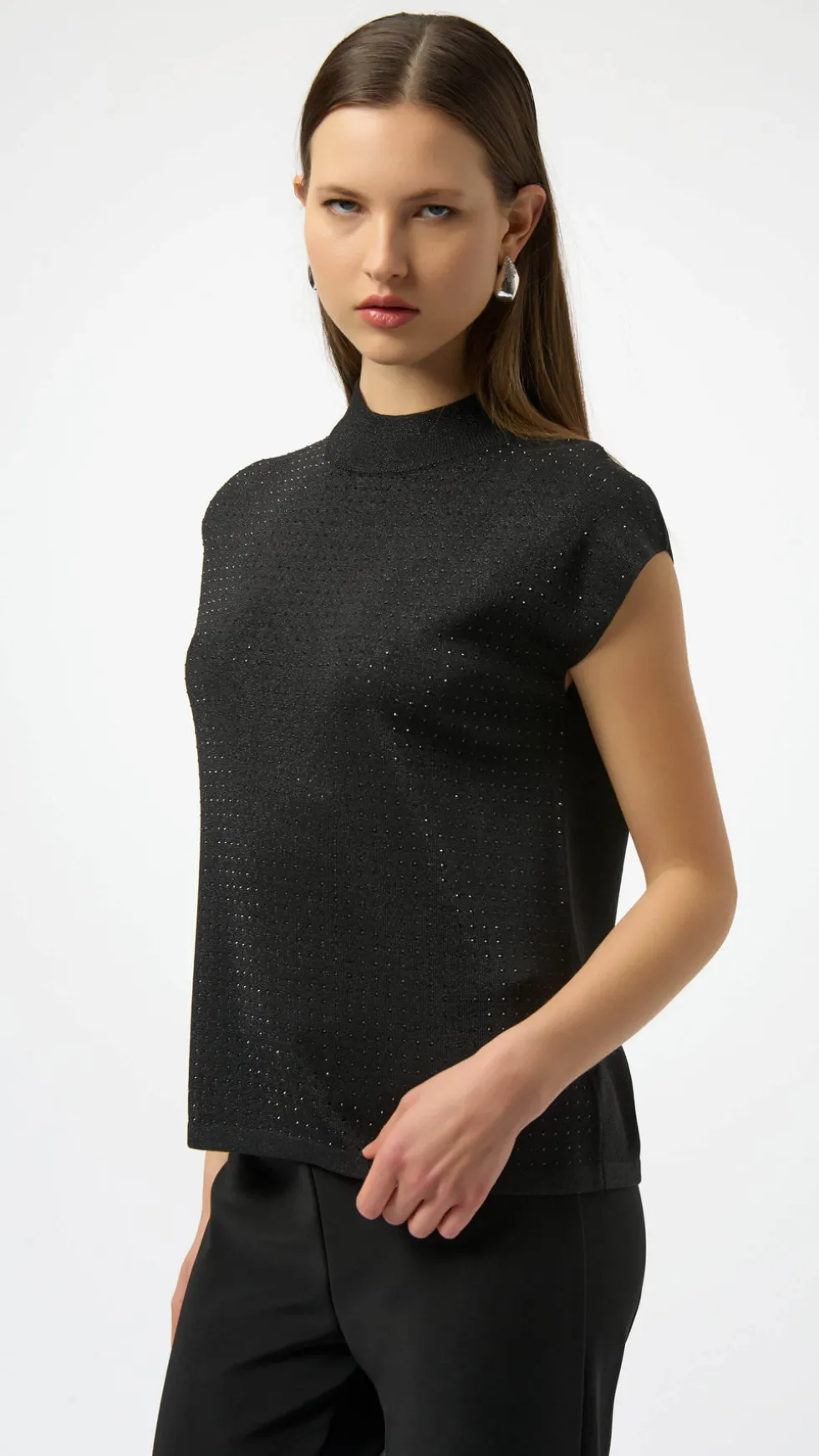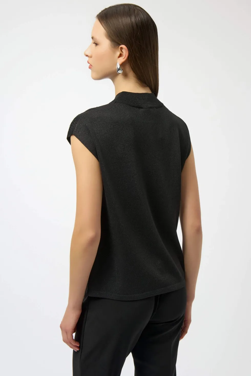 Sweater Sleeveless Knit – Black 254935 by Joseph Ribkoff at The Wardrobe. This versatile sleeveless pullover is a chic addition to your occasion wardrobe, featuring a sophisticated mock neck and elegant iron-on detailing. Crafted from a soft sweater knit in a flattering straight fit, it pairs beautifully with a variet