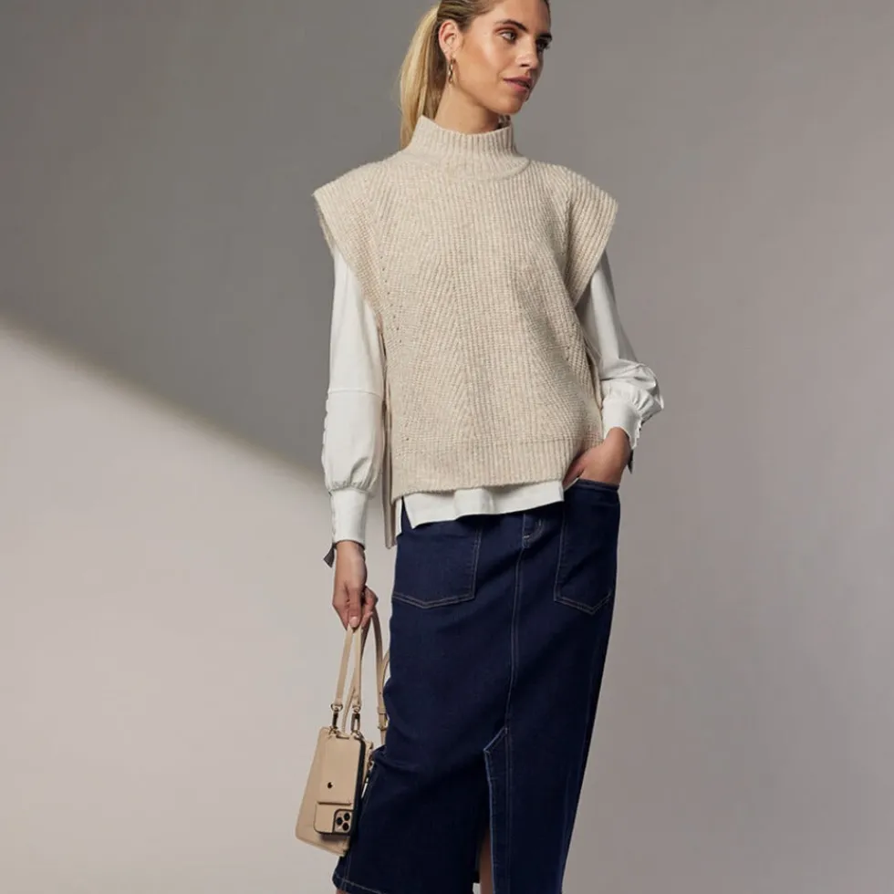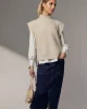 Oversized ribbed tank with a dropped-shoulder, featuring a deep turtleneck with wrap-over side-buttoning creating a stepped hemline. 57% Acrylic 40% Nylon 3% Wool Turn garment inside out. Remove jewellery before washing. Gentle cool hand wash separately with mild detergent. Do not bleach, soak, rub or twist. Reshape g