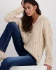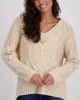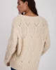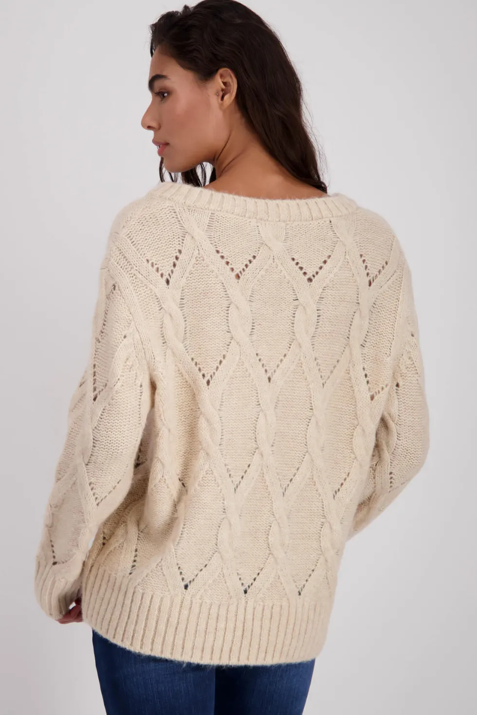Braid Fleece Sweater – Biscuit 807225 by Monari at The Wardrobe. 58% acrylic; 30% polyester; 12% wool This fluffy pullover has a feminine design due to the cable stitch pattern with gaps. Its soft poly-acrylic blend makes it comfortable to wear. Soft poly-acrylic blend; Fleece yarn; Cable stitch pattern with gaps; Regu