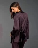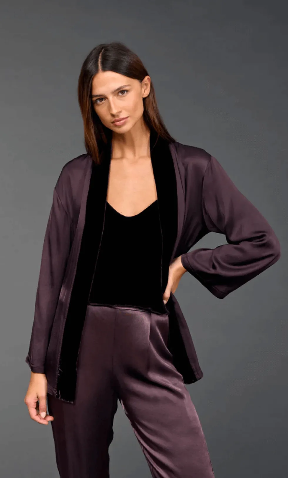 Amber Two – Material Kimono by Lauren Vidal at The Wardrobe. Kimono jacket in viscose and silk. Dropped shoulders. Viscose belt with belt loops at the waist. Wide velvet bands in front in viscose and silk. It is worn with the BELLA velvet top underneath. 82%VISCOSE18%SILK