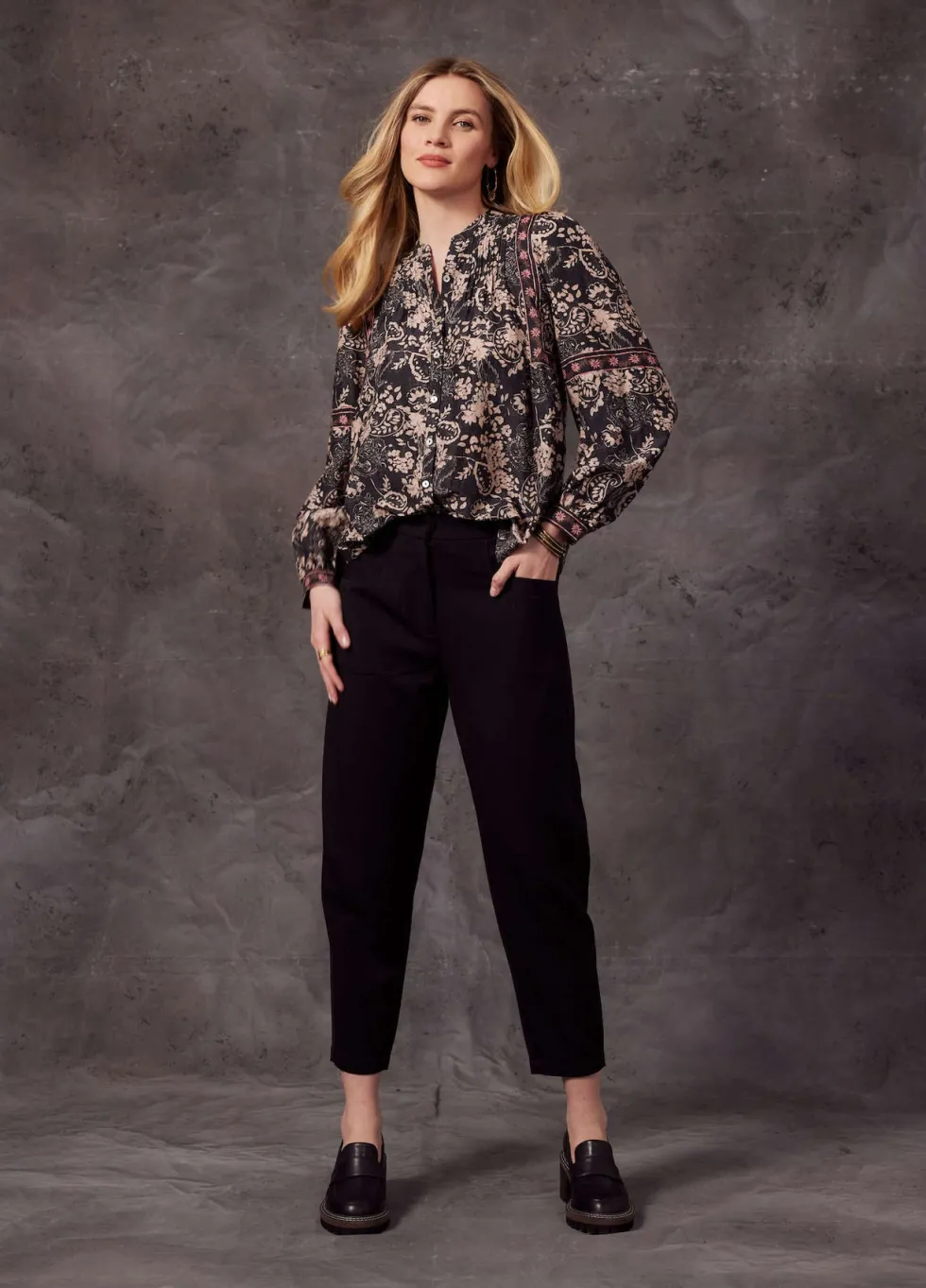 Bethany Pant – Black LS2668 by Loobies Story at The Wardrobe Relaxed pant with a fly front with a hidden hook closure with front pockets and functional back pockets, and an elasticated back waist band. Featuring darts at the hem to create a tapered shape . Gentle cold machine wash with like colours using mild detergent