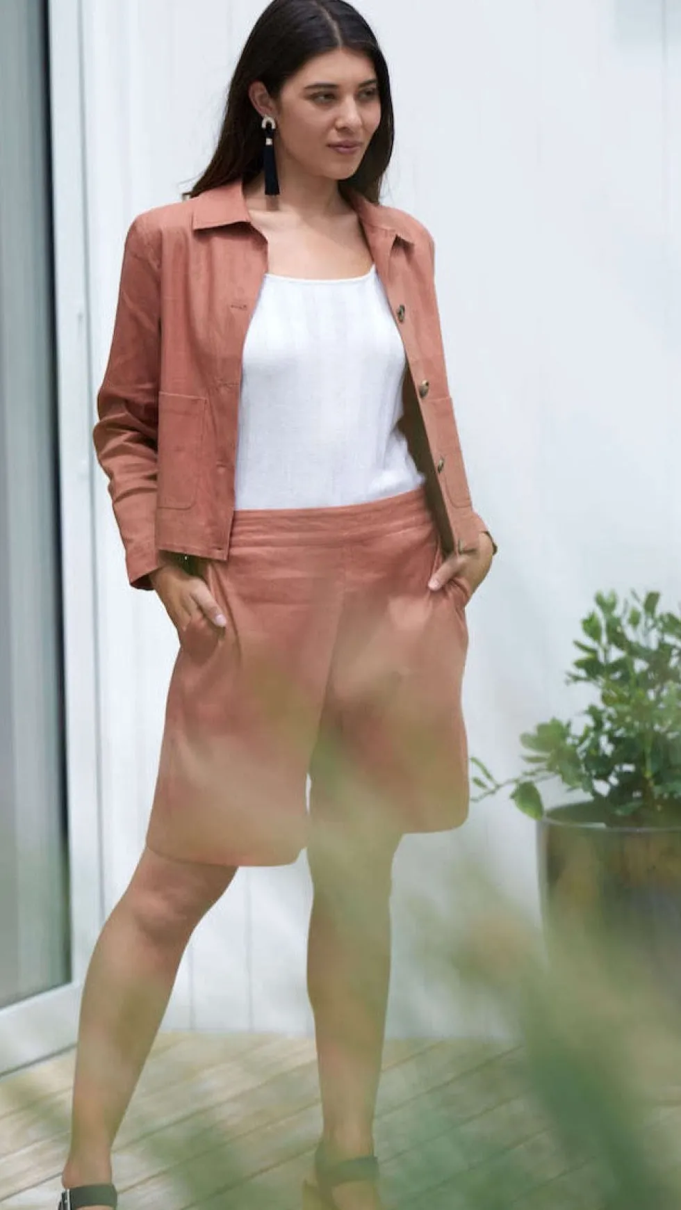 Good Life Short – Toffee 7477 by Foil at The Wardrobe 55%Linen, 42% Viscose, 3% Elastane Elastic back of waistband Flat Front Side Pockets