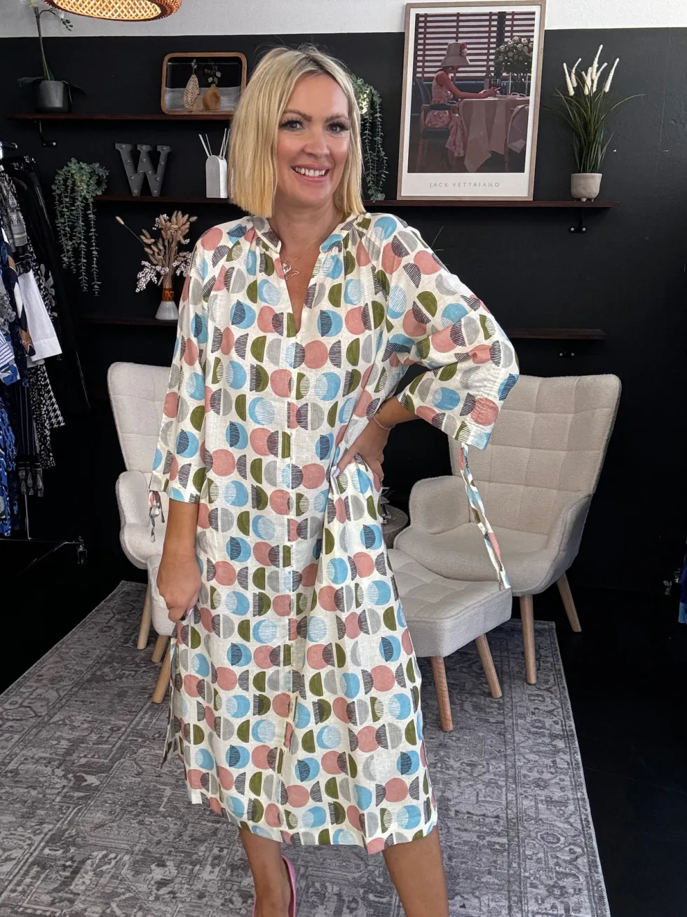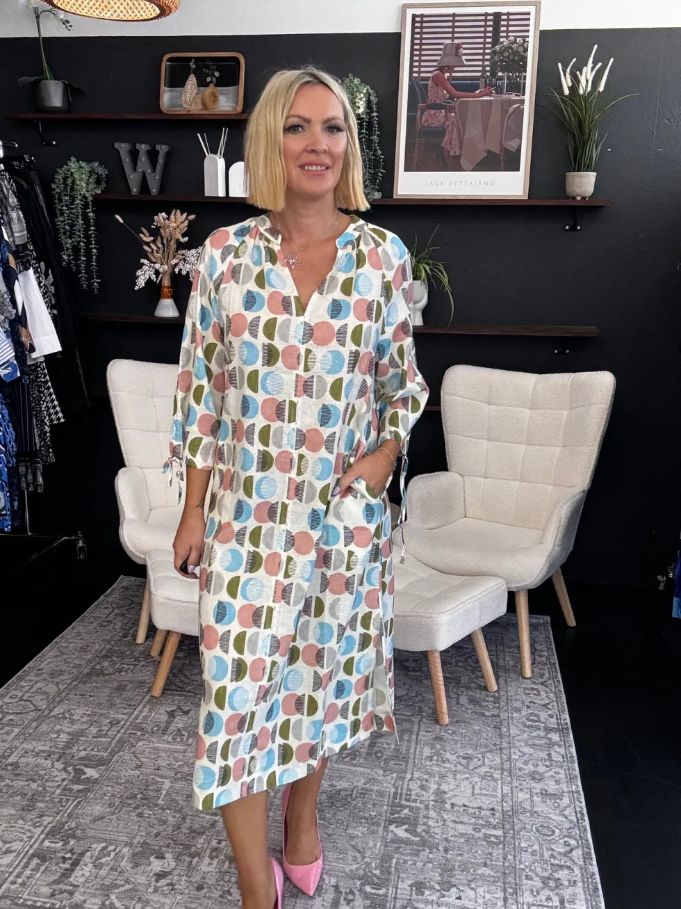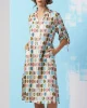 A-line midi dress with a V-neckline and 3/4 sleeves that can be rouched and tied, with stitched down side pockets and side splits. 55% Linen, 45% Rayon Gentle cold machine wash with like colours, using mild detergent. Do not rub/soak//wring/bleach. Do not tumble dry. Dry away from direct sunlight. Warm iron if desired.