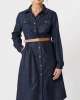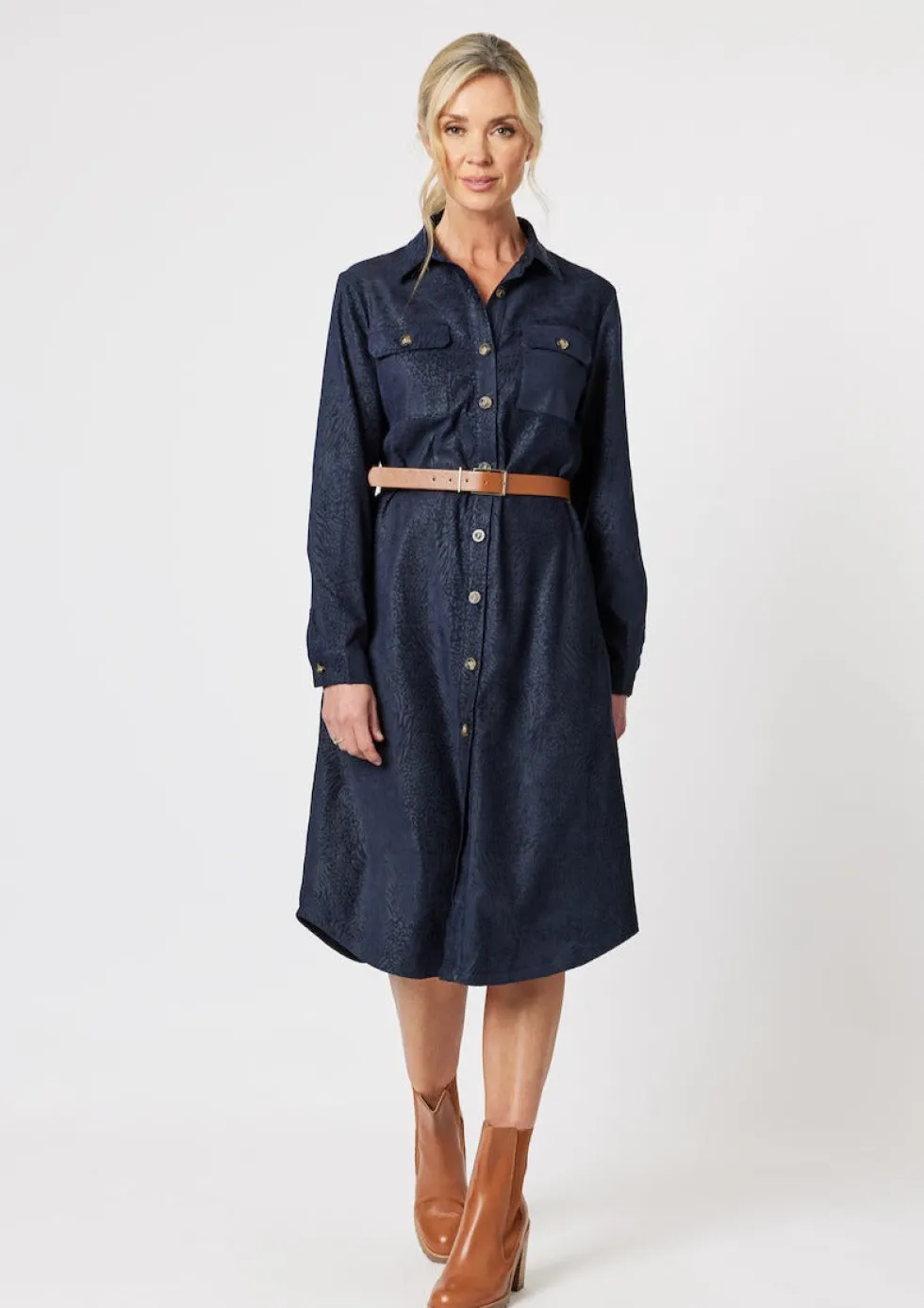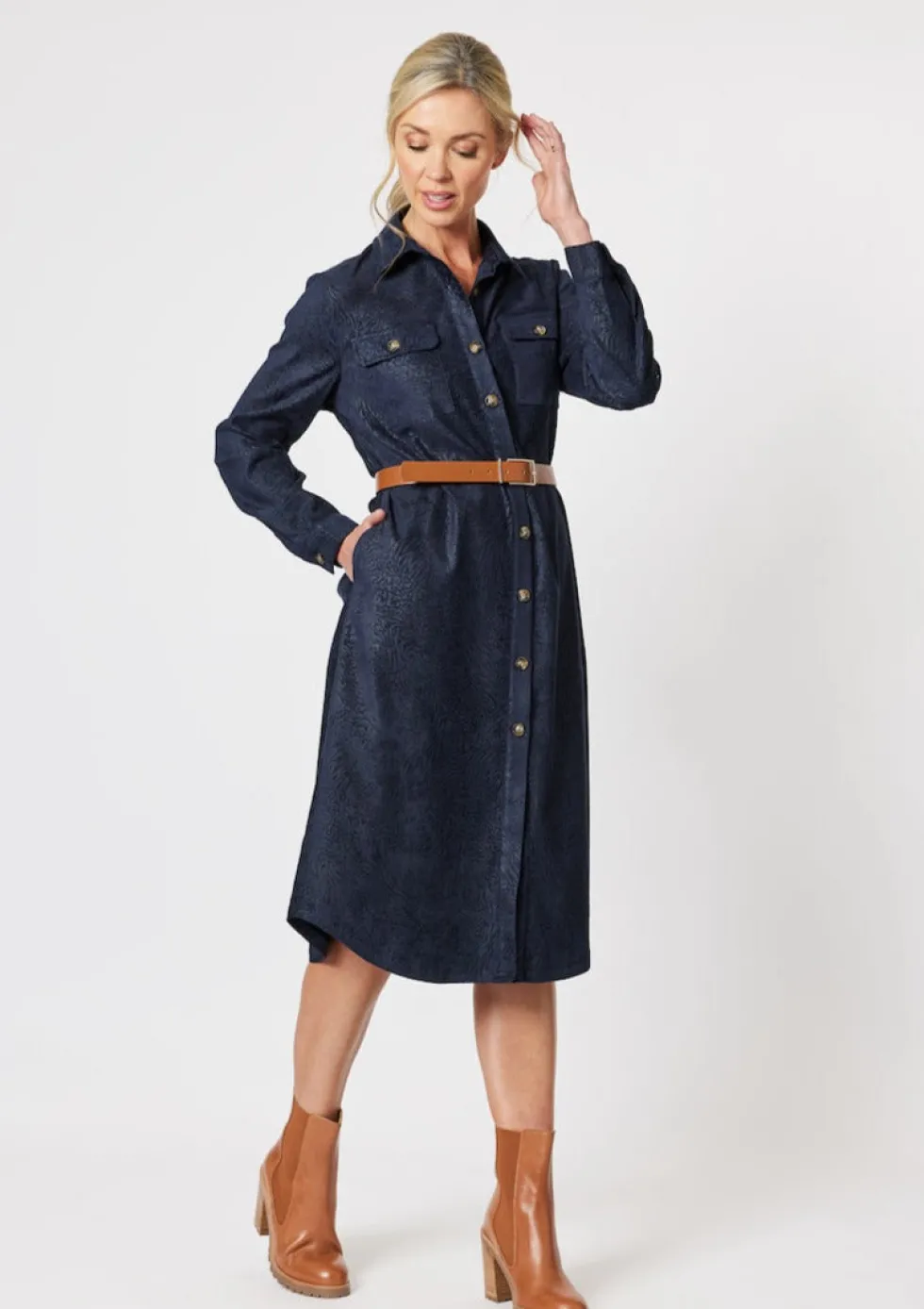 Animal Print Suede Feel Shirt Dress – Midnight Blue 42330 at The Wardrobe Collared button-through dress with curve hem Long sleeve with button cuff Embossed Suede Animal print design Functional top-flap breast pockets Tortoiseshellbutton detail Self-belted waist with belt hoops 100% Polyester Fit Guide: Relaxed fit S