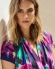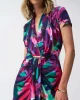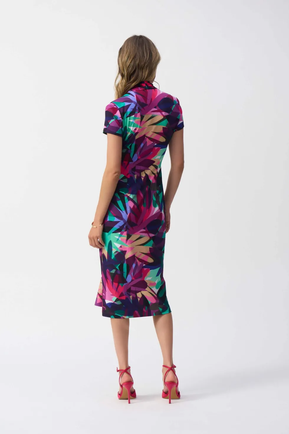 Paradise Cove Tropical Print Wrap 251042 by Joseph Ribkoff at The Wardrobe. Indulge in the utmost glamour while wearing this silky knit dress. Exquisitely adorned with a vibrant tropical print, the garment was tailored to be a unique standout. The wrap neckline and short cap sleeves infuse charm into the design while t