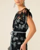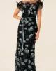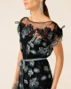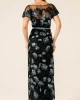 Love Potion Maxi Dress – Black Aqua Teal by Sacha Drake at The Wardrobe. Turn heads at weddings and events with the Love Potion Maxi Dress, made from an exquisite embroidered floral mesh. Featuring adjustable beaded cap sleeves, a braided belt, and adjustable slip, this boat-neck maxi exudes romance and elegance. • Out