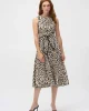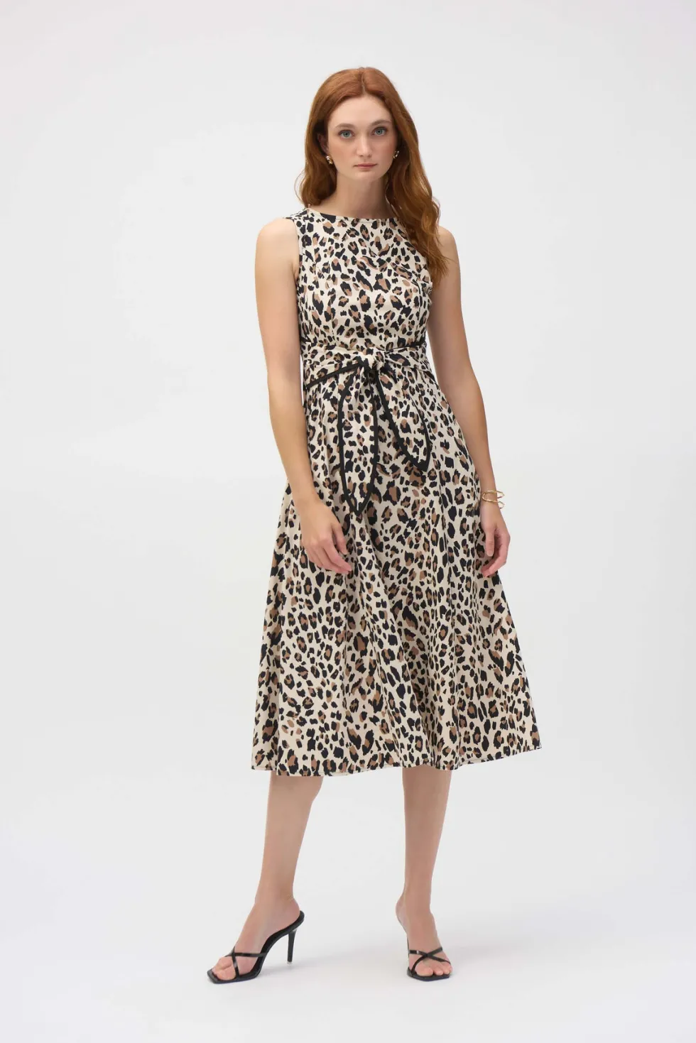 Savannah Poplin Animal Print Fit and Flare Dress 252095 by Joseph Ribkoff at The Wardrobe. This stretch poplin dress is designed to turn heads and showcase your impeccable style. The striking animal print meets a flattering fit and flare silhouette, lending a sophisticated feel to the garment. The front sash, trimmed i