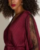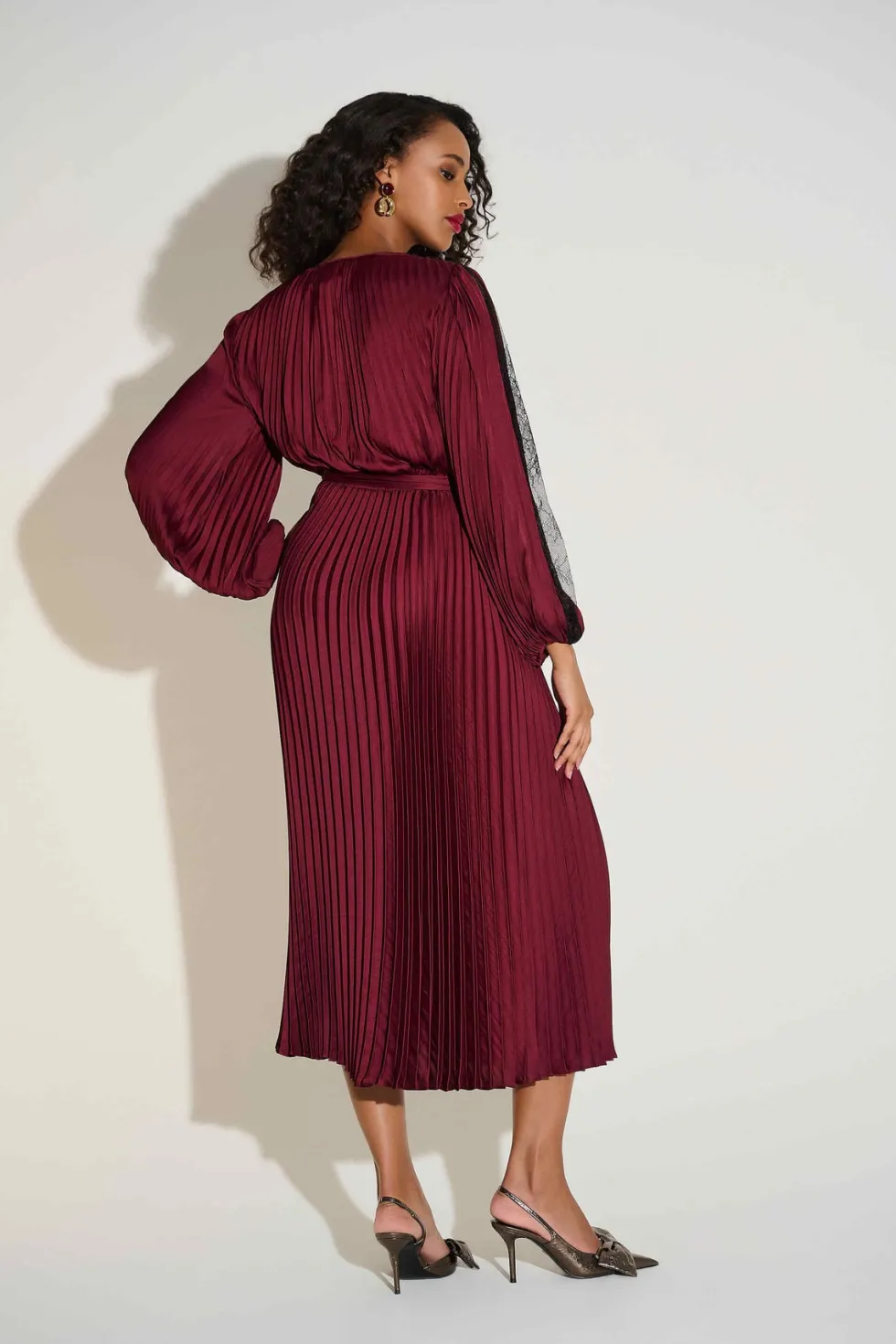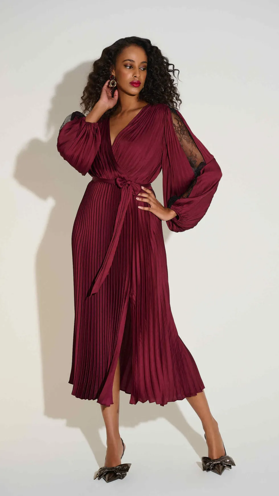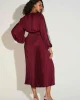 Signature | Pleated Satin Fit & Flare Dress 253775 by Joseph Ribkoff at The Wardrobe. Step into sophistication with this stunning fit and flare midi dress. Featuring a pleated satin design, a wrap neckline, and flowy dolman sleeves, it exudes timeless charm. The elastic waistband, accentuated with a sash, creates a