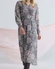 Valentina Dress 3771 by Lania The Label at The Wardrobe 63% Viscose, 37% Rayon Embrace effortless elegance with the Valentina Dress, a midi-length silhouette in theValentina print on a viscose rayon blend fabric. Scallop edge embroidery adds charm to the neckline, adorned with delicate antique brass buttons. Floaty sle