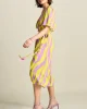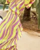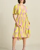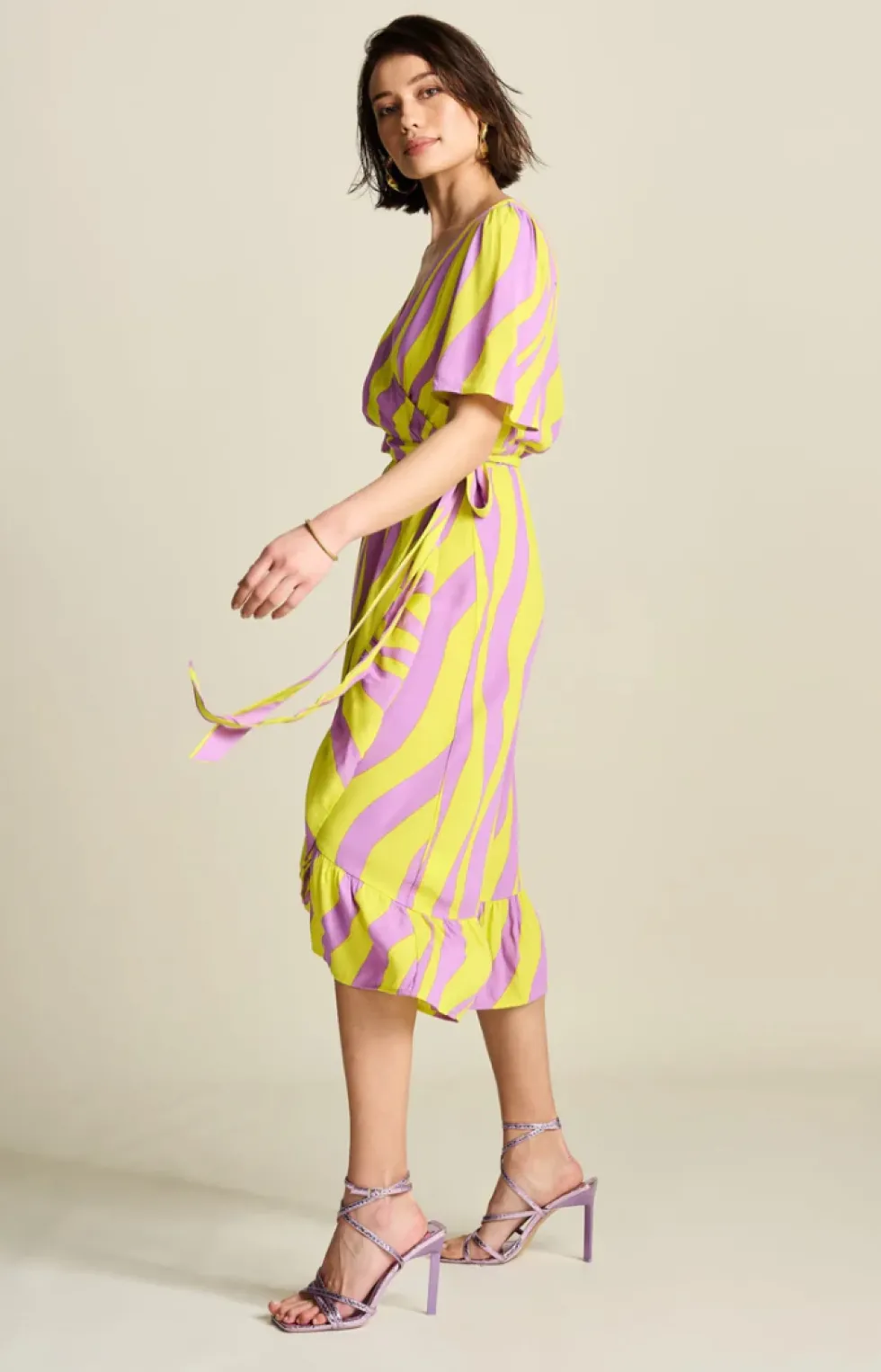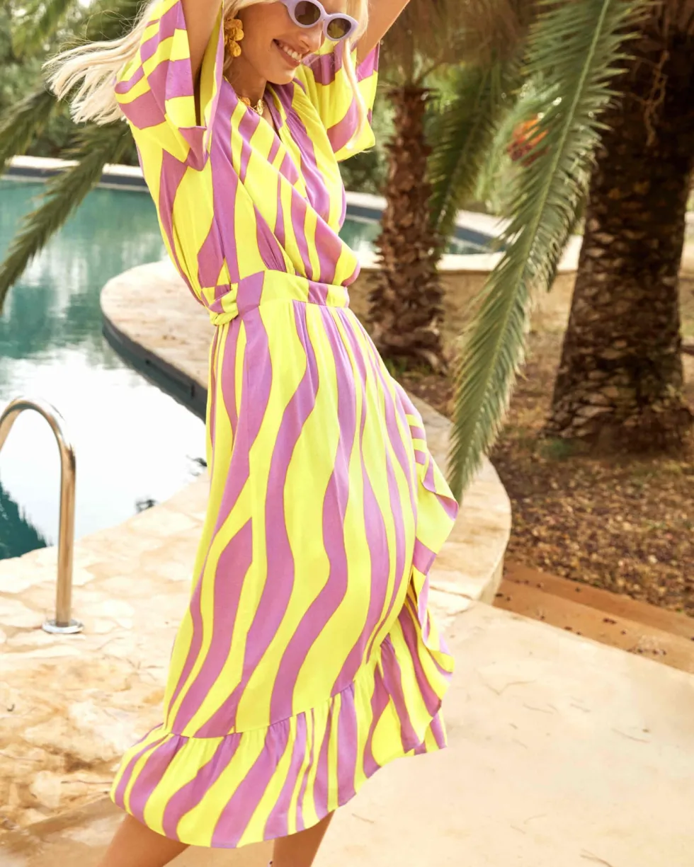 This yellow dress has a purple pattern of asymmetrical stripes. The dress has an elegant wrap detail with a ruffle and a tie belt at the waist. Thanks to the use of LENZING™ ECOVERO™ fabric, the dress fits smoothly and the item is 'more sustainable'.• Yellow dress• Wrap design• Purple wave pattern• Short butterfly slee