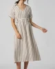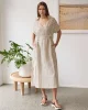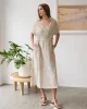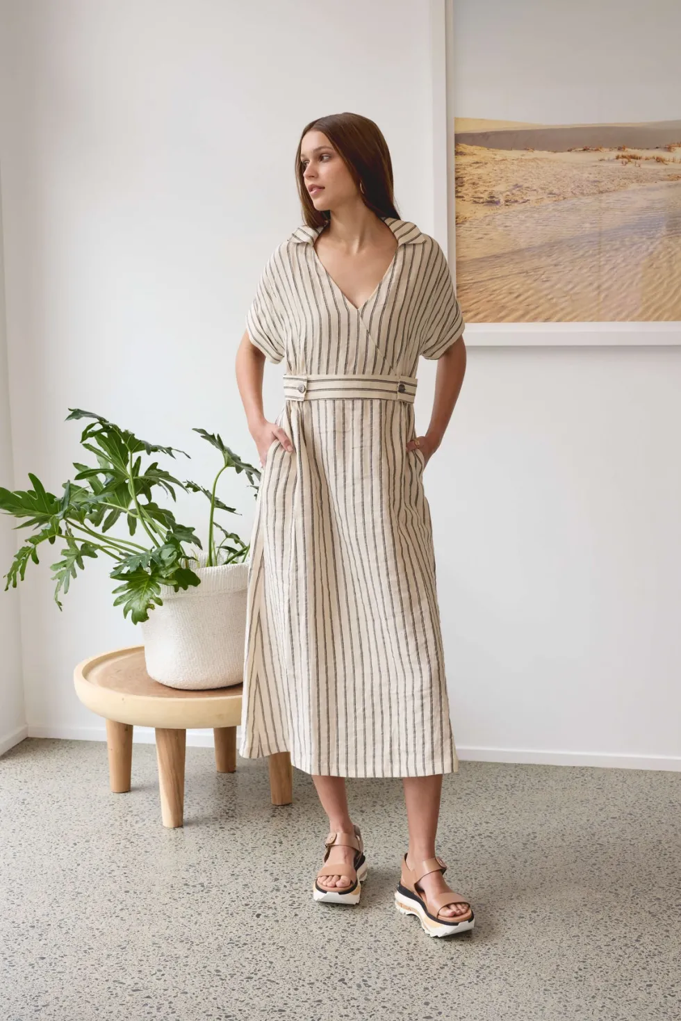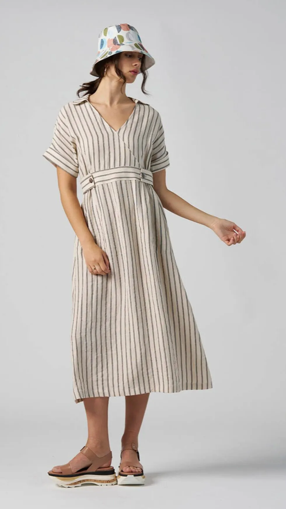 Midi dress with a V-neckline with faux wrap bodice, fold-up cuffs and in-seam pockets.Partially elasticized band with buttoned tabs. 70% Linen, 30% Polyester Gentle cold machine wash with like colours, using mild detergent. Do not rub/soak//wring/bleach. Do not tumble dry. Dry away from direct sunlight. Warm iron on r