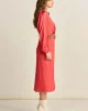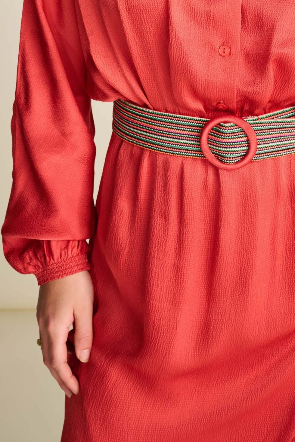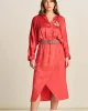 This red dress has a satin look in a beautiful red colour. The dress is finished with buttons and matching belt.• Midi dress• Comes with extra belt• Detachable brooch• Slanted slit in the middle• Long sleeves finished with buttonsFit: The dress is straight and comes roughly to the calf. The model in the photo is 173 c