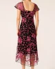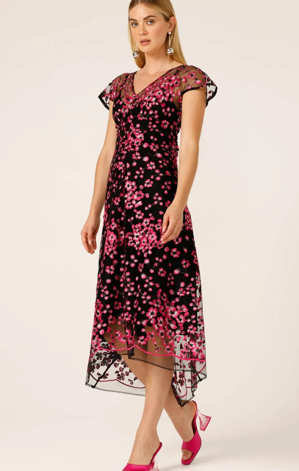 This is a sale item and is only eligible to return for a store credit or exchange. Joan Orchid Dress by Sacha Drake at The Wardrobe. Pretty and feminine, the Joan Orchid Dress will make you feel beautiful. The dress boasts a rich palette of pink and black florals. The sheer sleeves with intricate embroidered detail and