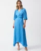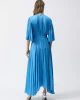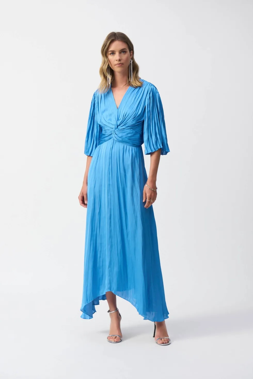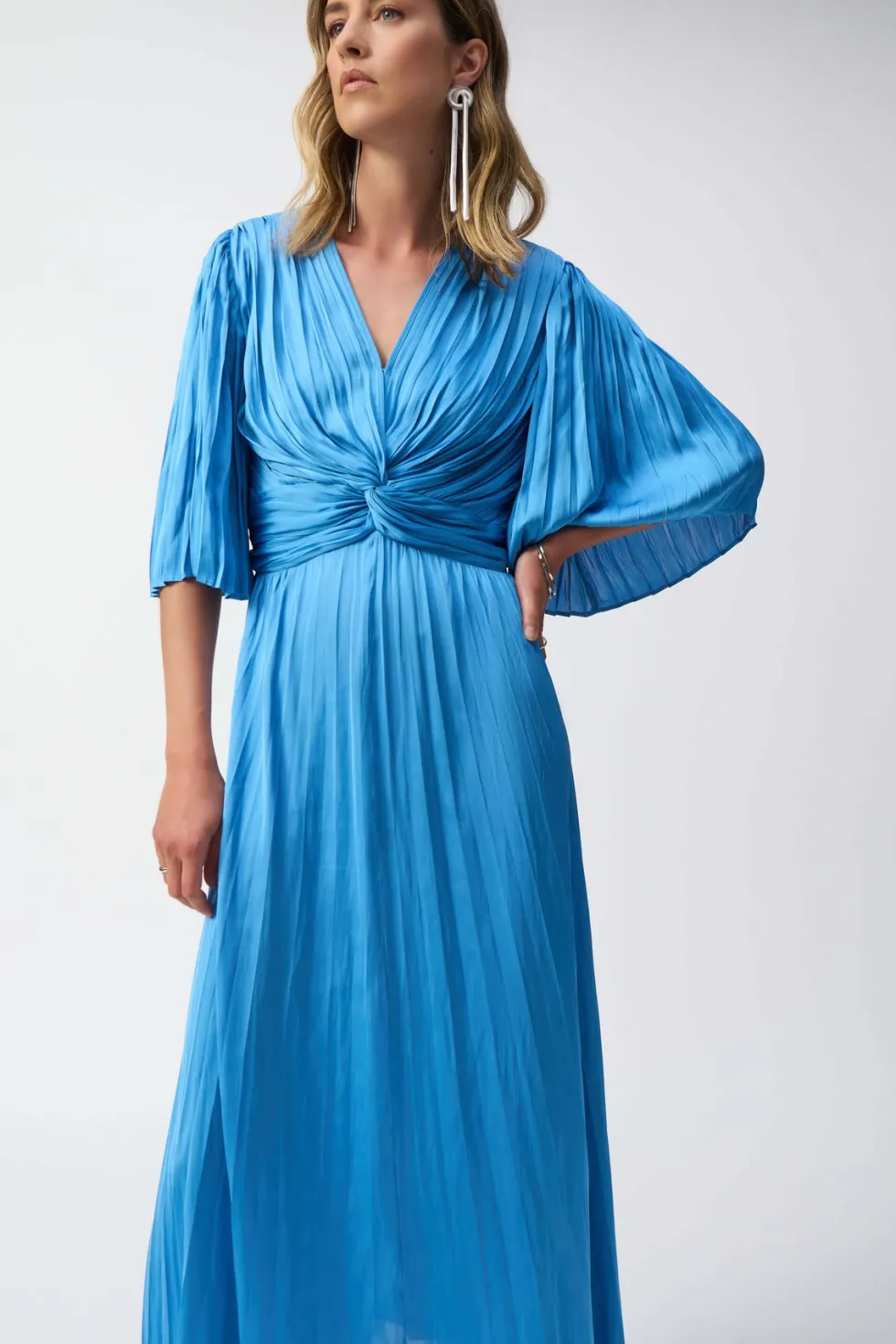 Hero Pleated Satin Midi Dress – Coastal Blue 251903 by Joseph Ribkoff at The Wardrobe. Crafted from a divine woven satin this midi dress pairs soft pleated elbow sleeves with a flowy trapeze silhouette. A knotted waist detail adds oomph and definition, while a lovely v-neck complements the decolletage. 100% Polyester W