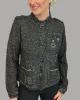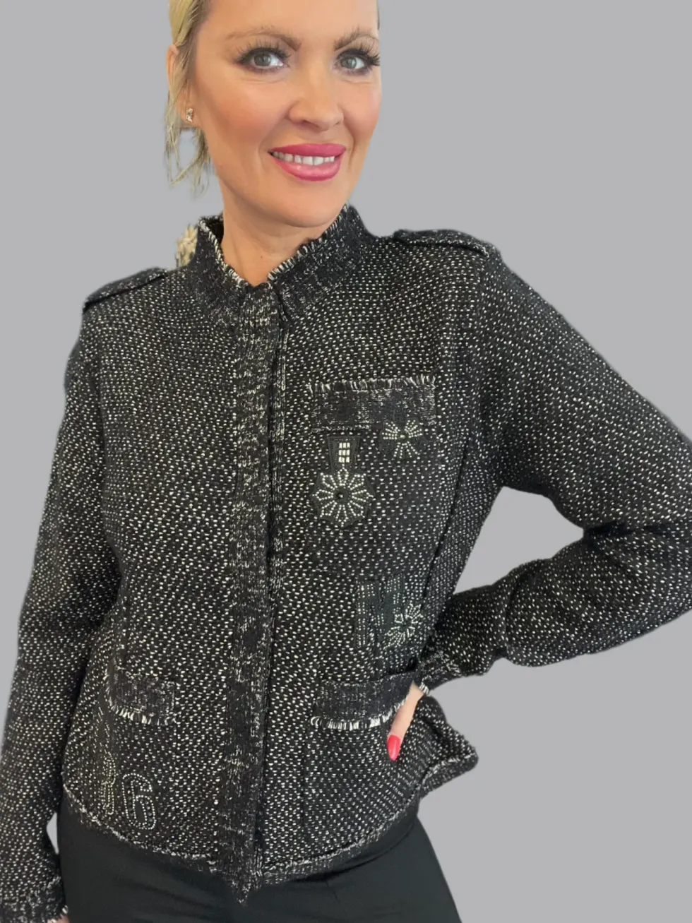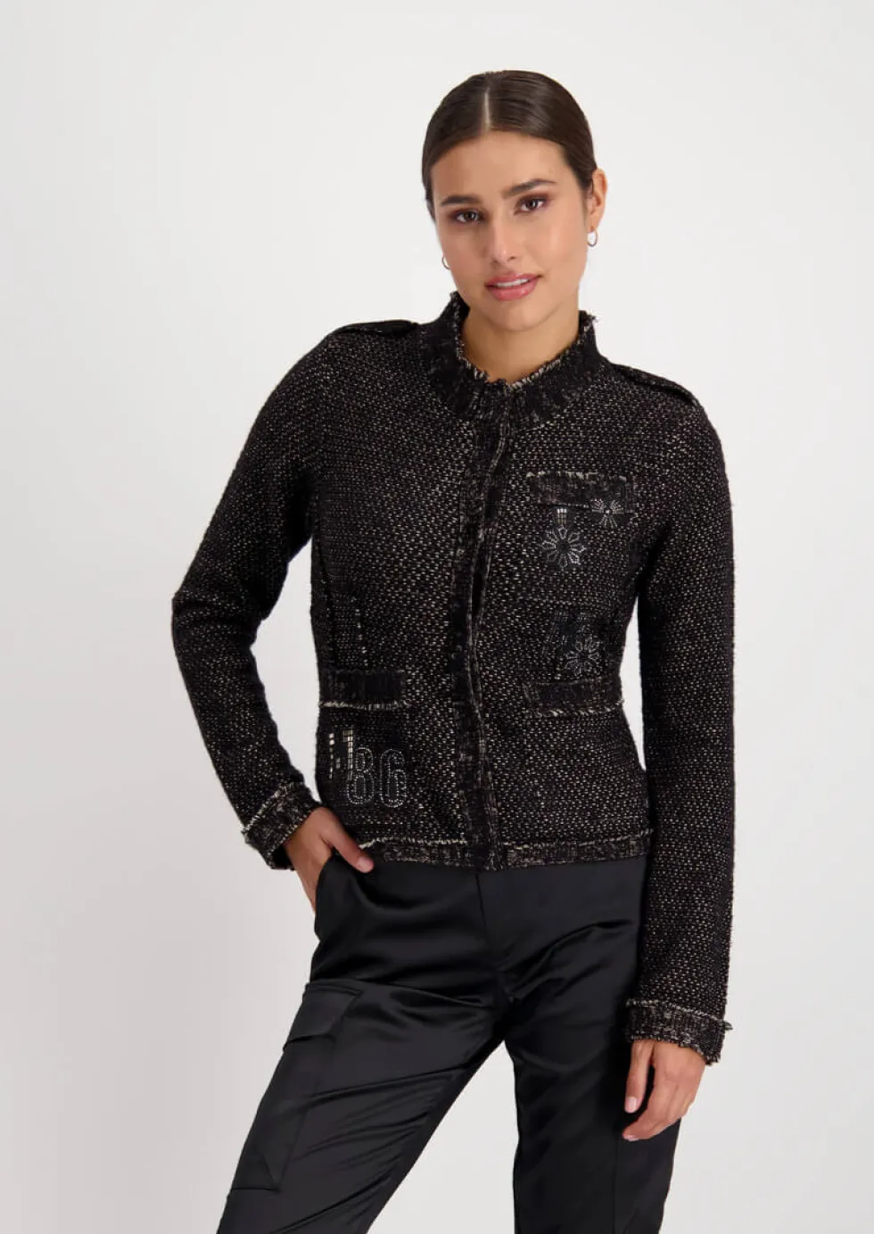 Knit Patches Jacket – Black 807364 by Monari at The Wardrobe. 30% Cotton; 28% Acrylic 18% Wool; 12% Polyamide 12% Metallized Polyester