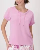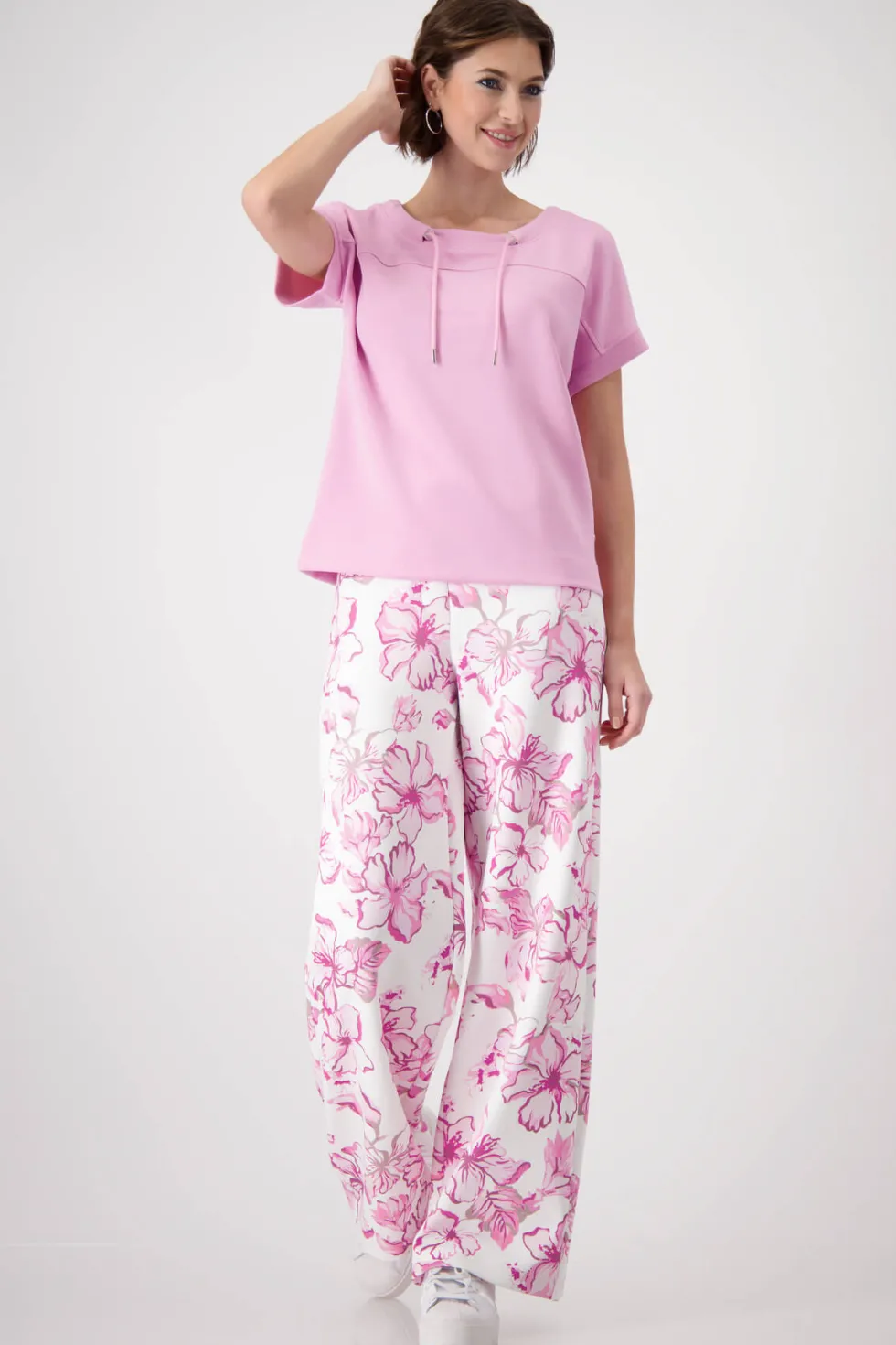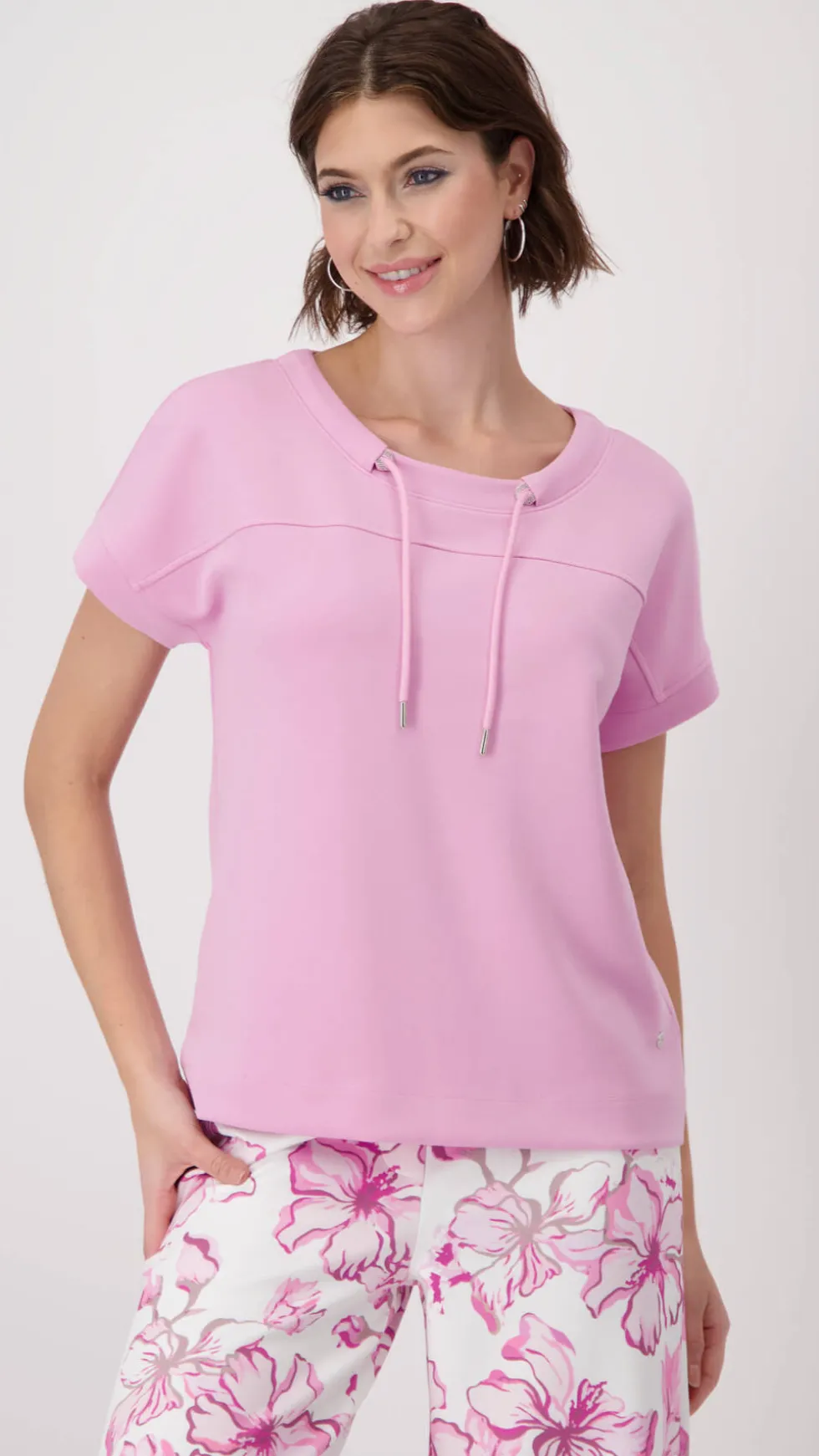 Embellished Sweatshirt – Bubblegum 409363 by Monari at The Wardrobe. Modal blend Stretchy material Sweatshirt Soft feel Regular fit Stand-up collar with eyelet charm and drawstring Slightly oversized short sleeves Sleeve cuffs Logo plate The model is 1.80 m tall and wears size 36. The length of size 38 is 60 cm. This s