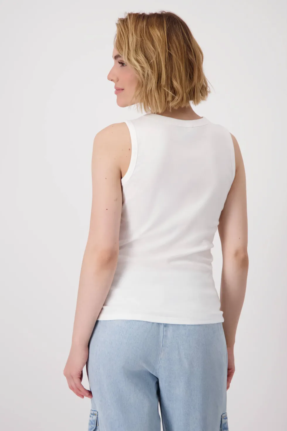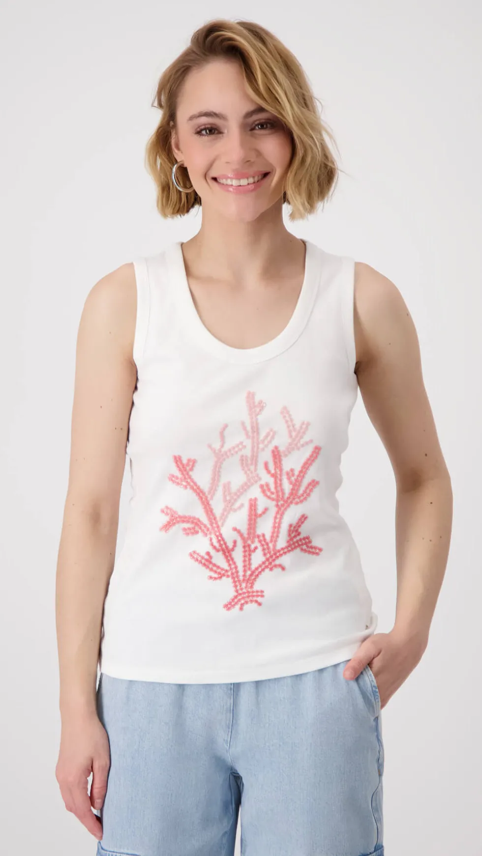 Round Neck Coral Rib Tank – Cream/Pink 409639 by Monari at The Wardrobe 100% Cotton 30°C very mild fine wash, Do not bleach, Do not tumble dry, Iron at low temperature, Do not dry-clean