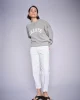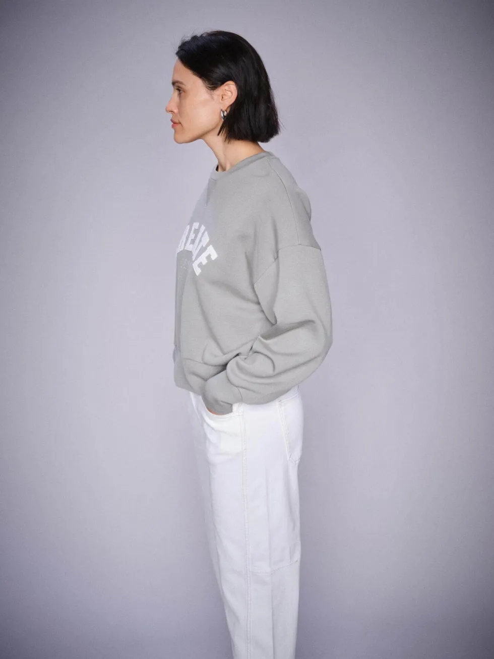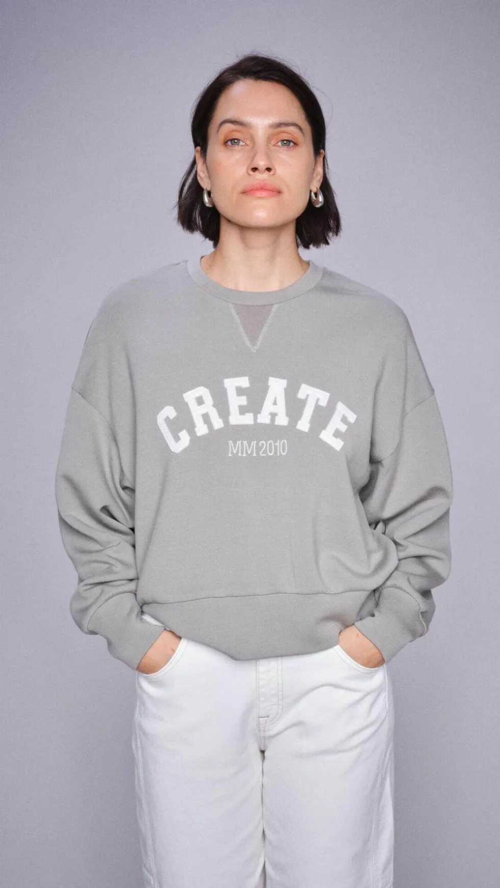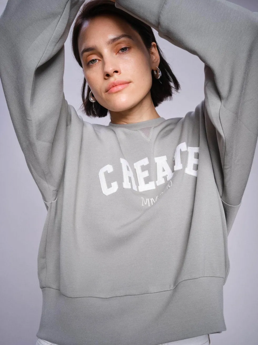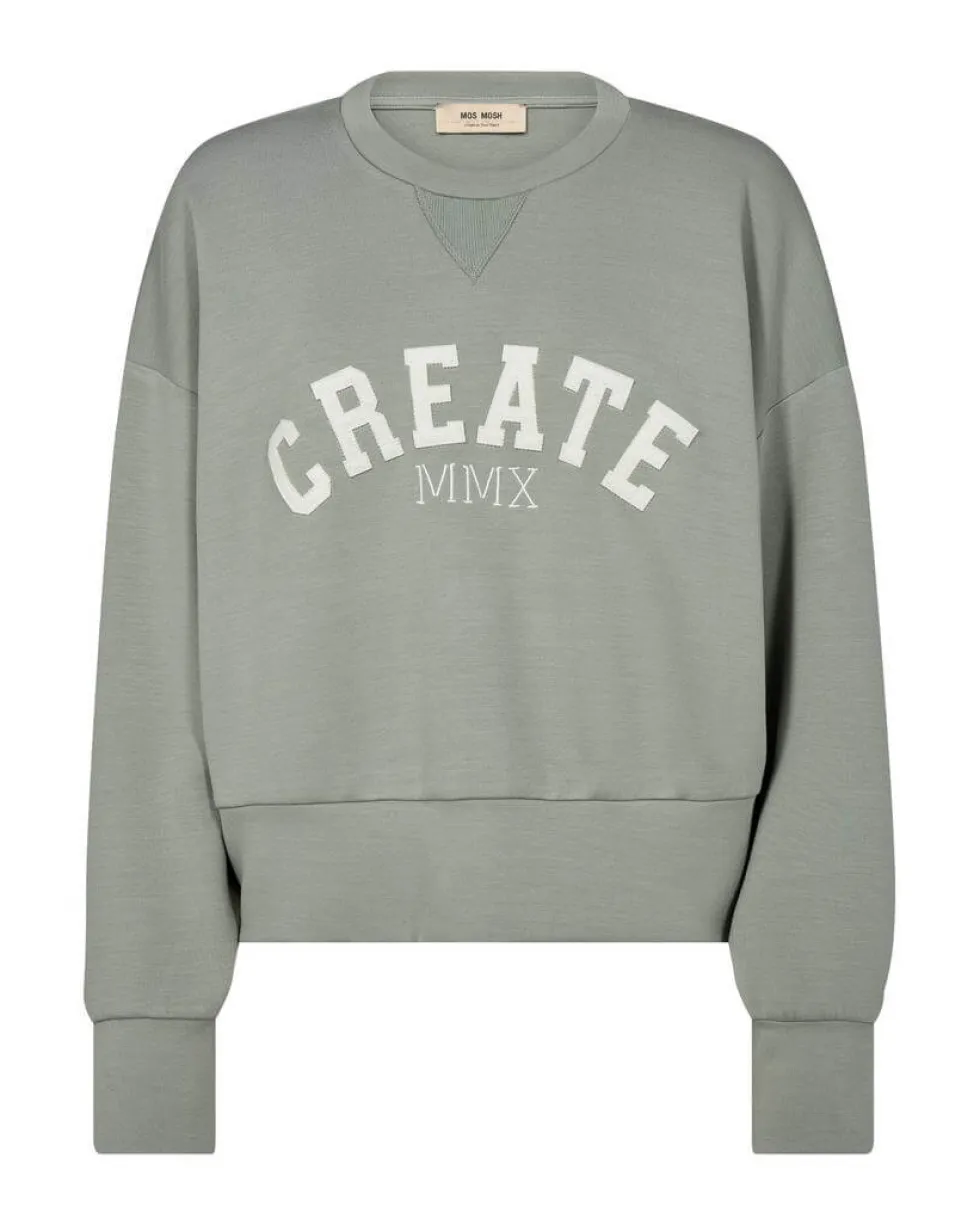 Celli Sweat Shirt – Shadow Sage 168550 by Mos Mosh at The Wardrobe. Achieve effortless cool with this must-have sweatshirt, featuring a relaxed fit, drop shoulders, and bold chest lettering. With its voluminous sleeves and preppy, retro college vibe, it pairs perfectly with dark blue denim for a standout look. 80% LEN