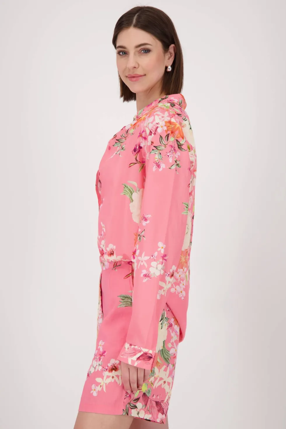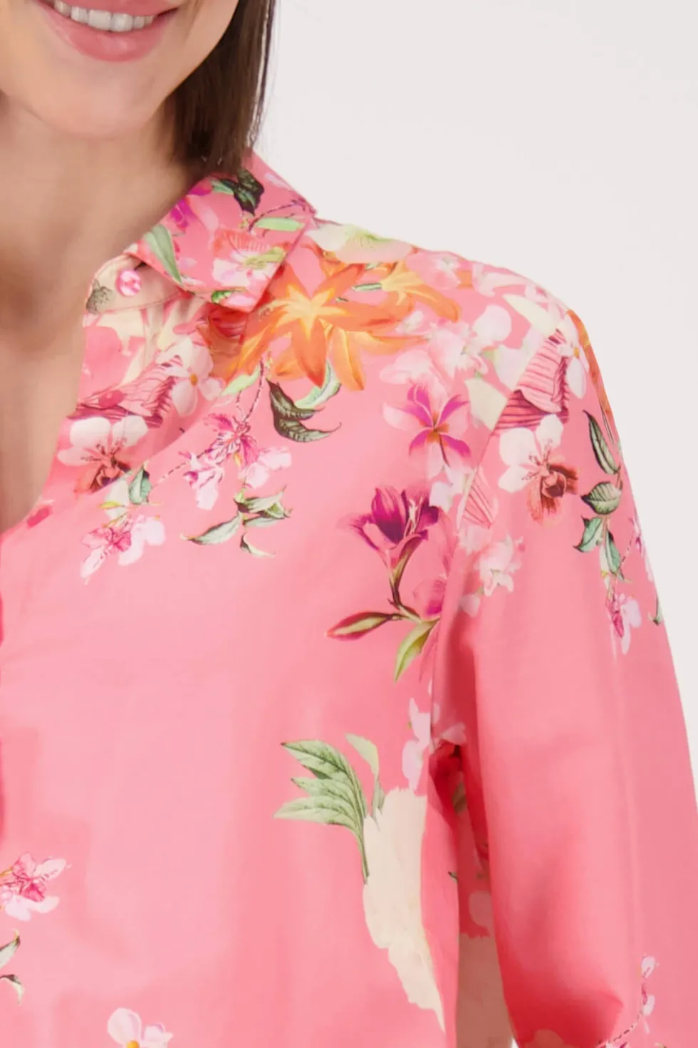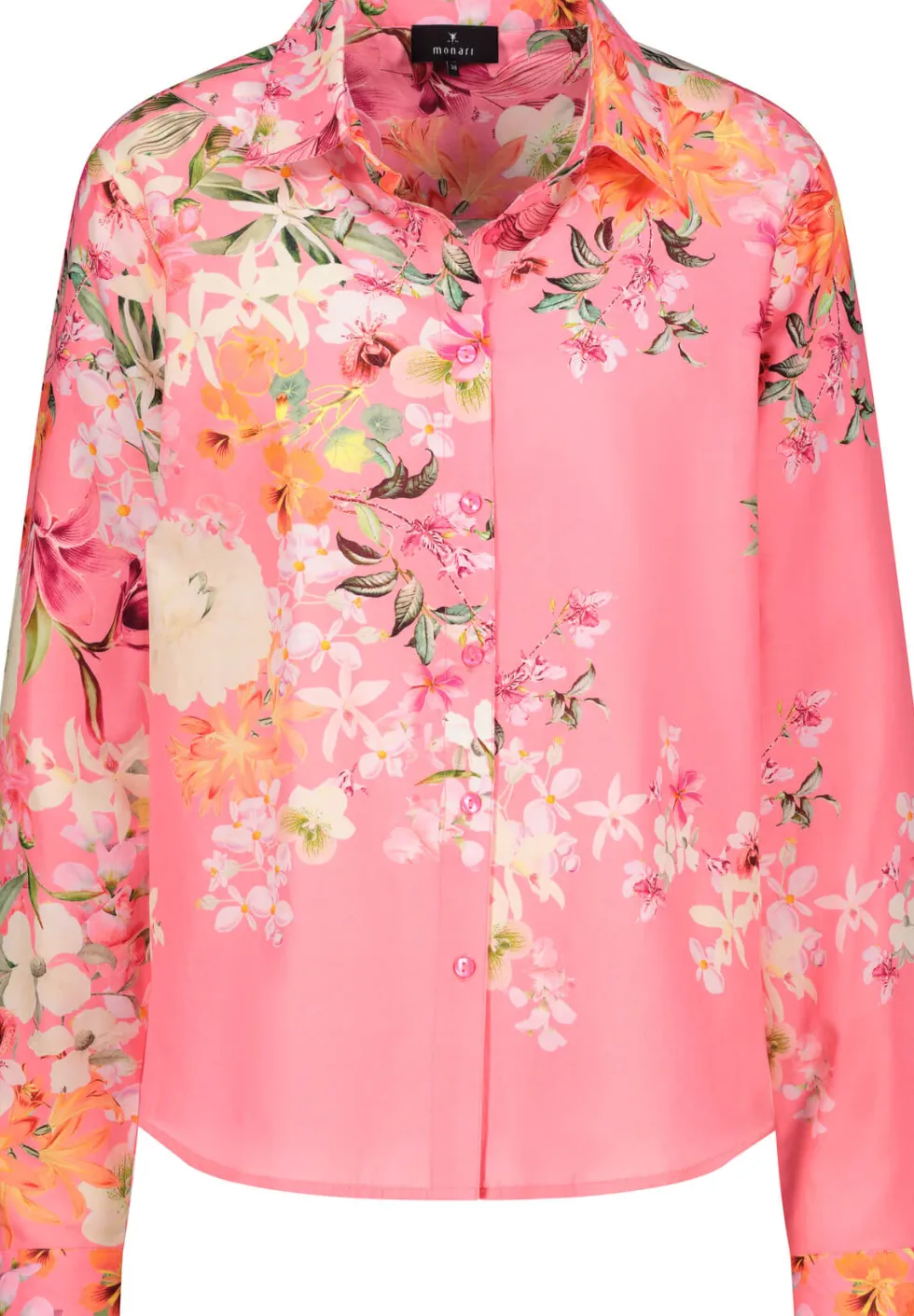 Bermuda Floral Blouse 409638 by Monari at The Wardrobe 55% cotton, 45% modal 30°C very mild fine wash, Do not bleach, Do not tumble dry, Iron at low temperature, Do not dry-clean