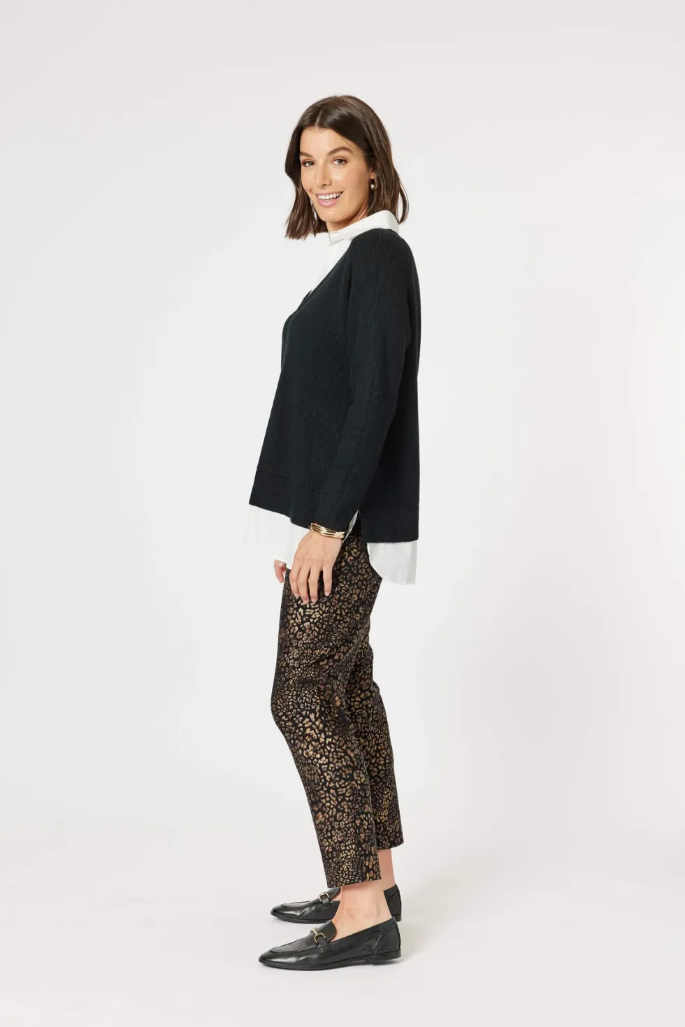 Mona Pant 46928 by Clarity at The Wardrobe. Experience the best of both worlds with this hybrid piece that combines the warmth of a coat and the comfort of a cardigan. With its unique stitch detailing and practical patch pocket, this stylish piece is sure to be a staple in your wardrobe. The single button closure and
