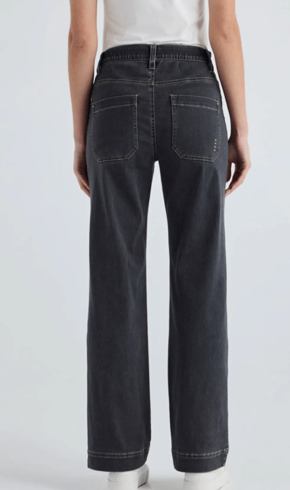 Chrome Jean – Charcoal 3764 by Lania The Label at The Wardrobe The Chrome Jean offers a wide-leg silhouette crafted from the softest stretch denim for unmatched comfort and style. Featuring front patch pockets adorned with cross-stitch embroidery. The deep hems allow for a lovely drape, making these jeans a wardrobe es