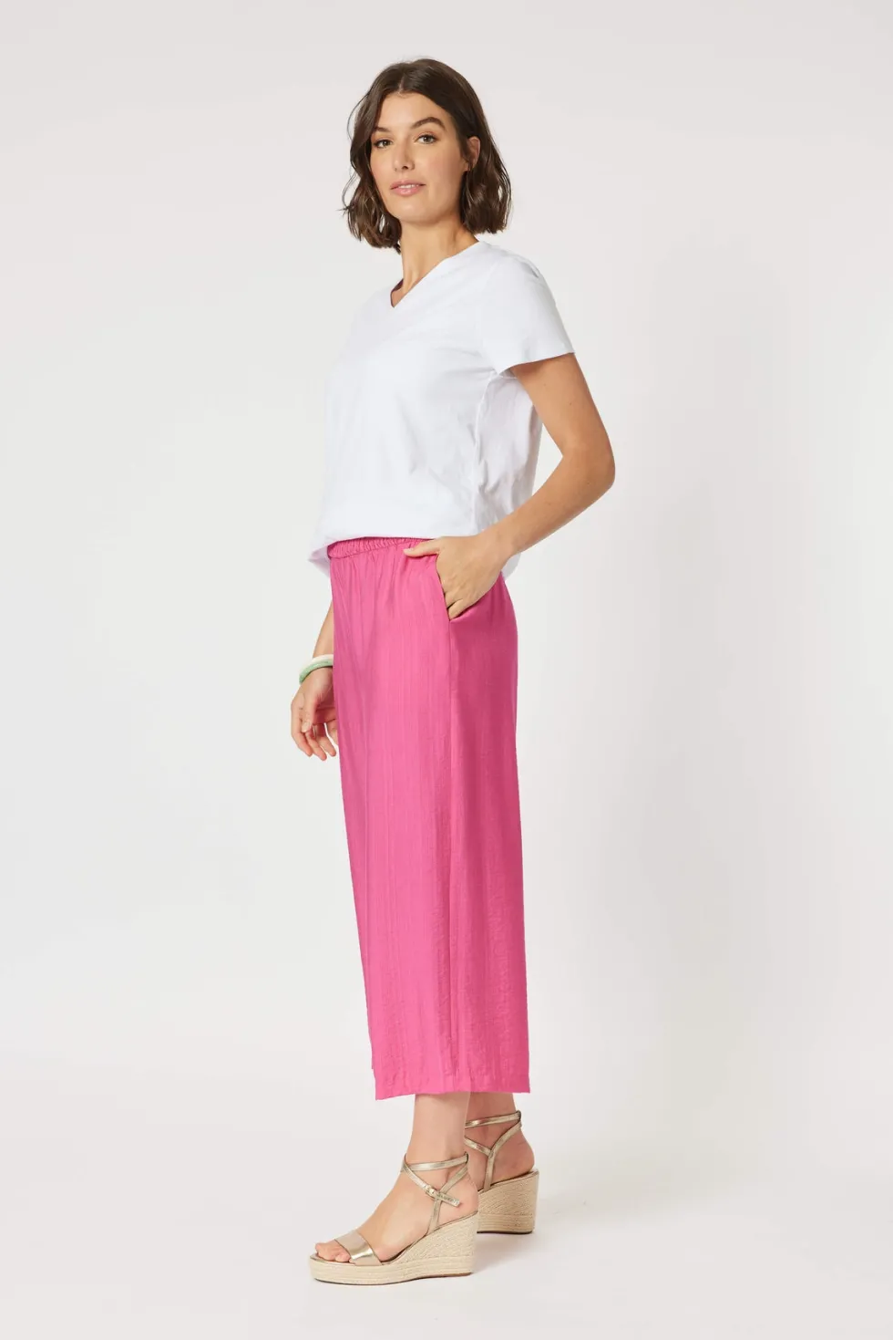 Villa Pant – Pink 45875 by Clarity at The Wardrobe Crafted from a premium textured viscose blend The Villa Pant By Clarity is this seasons "All Rounder" The Wide leg is so on trend and effortless to style in a dressy or casual way The elastic waistband creates incredible all day comfort You need a pair in every colour