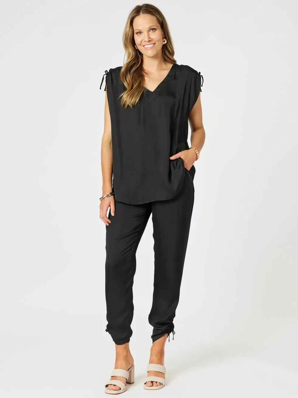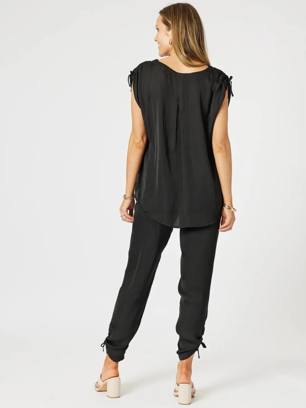 Traveller Luxe Side Tie Pant – Black 46142 By Hammock & Vine at The Wardrobe Features: So soft you would think you're wearing silk But of course we can wash these at home Designed to "Travel" with your life This is the pant you roll up and takes up no space in your luggage It is super quick, drying fabric, so wash