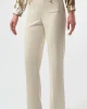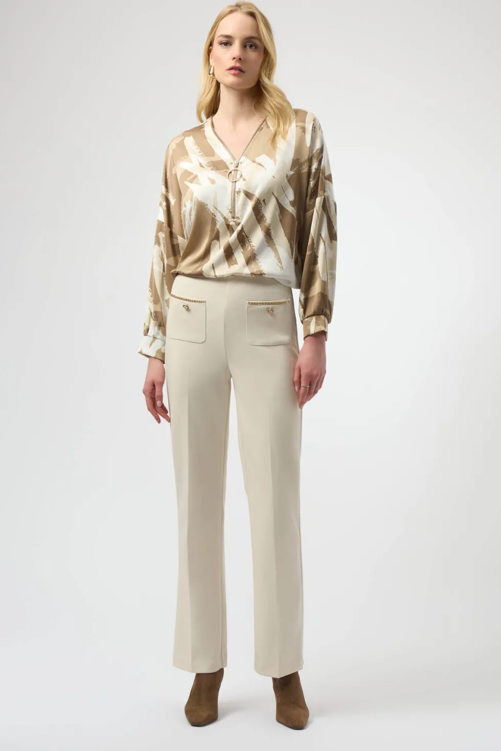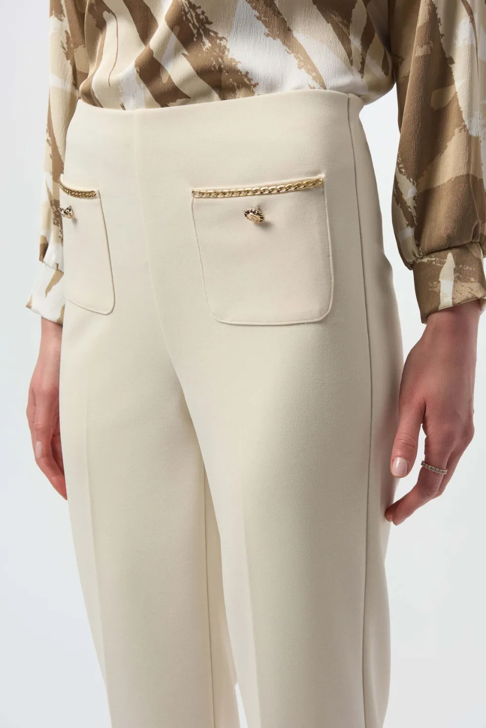 Dusk to Dawn Scuba Crepe Straight Pull On Pant – Birch 254043 by Joseph Ribkoff at The Wardrobe. These scuba crepe pull-on pants are tailored in a classic straight silhouette that flatters any figure. The front applied pockets with gold embellished details and buttons elevate the garment’s polished look. 95% Polyester