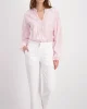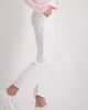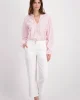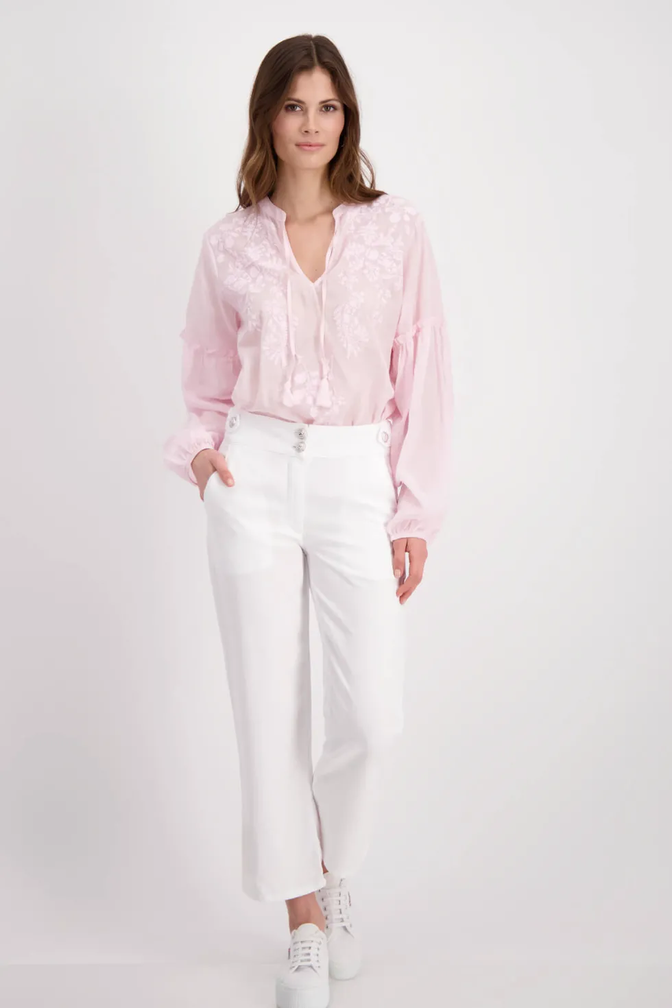 Linen Mix Crop Pants – White 408843 by Monari at The Wardrobe. Lyocell fabric mix; Soft feel; Tab with decorative button; In-seam pockets. Fake back pockets 84% Lyocell 16% Linen