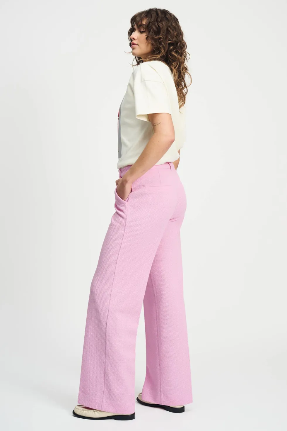 Wide Leg Textured Pant – Rose Pink 9105 by POM Amsterdam at The Wardrobe Discover these soft pink pants in our popular Piqué fabric made from recycled polyester. In an enhanced fit. Pair with the matching blazer and complete your look. 90% Recycled Polyester 7% Polyester3% Elastane Gentle machine wash at 30 degrees gen