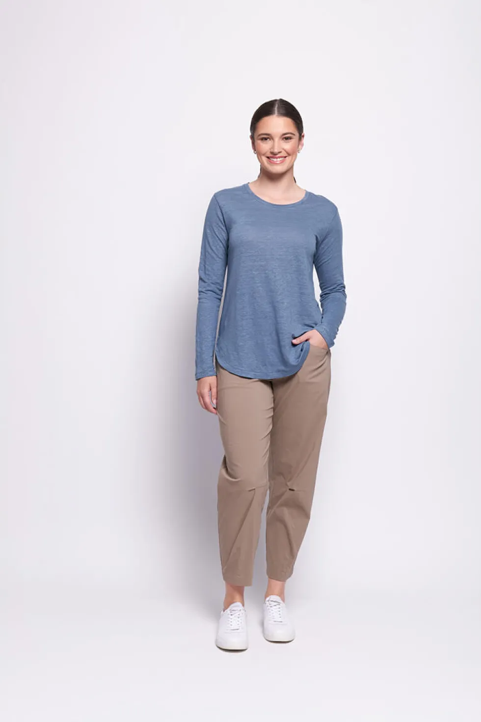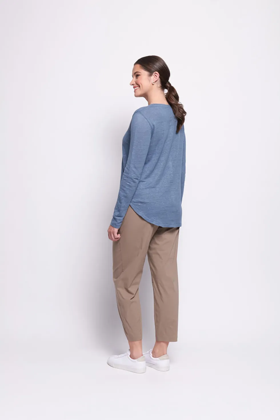 Long Slim Trapeze Pant – Latte by Foil at The Wardrobe 69% Cotton, 27% Nylon, 4% Elastene Elastic Waist , Pull on. Machine Washable . Do Not Dryclean