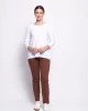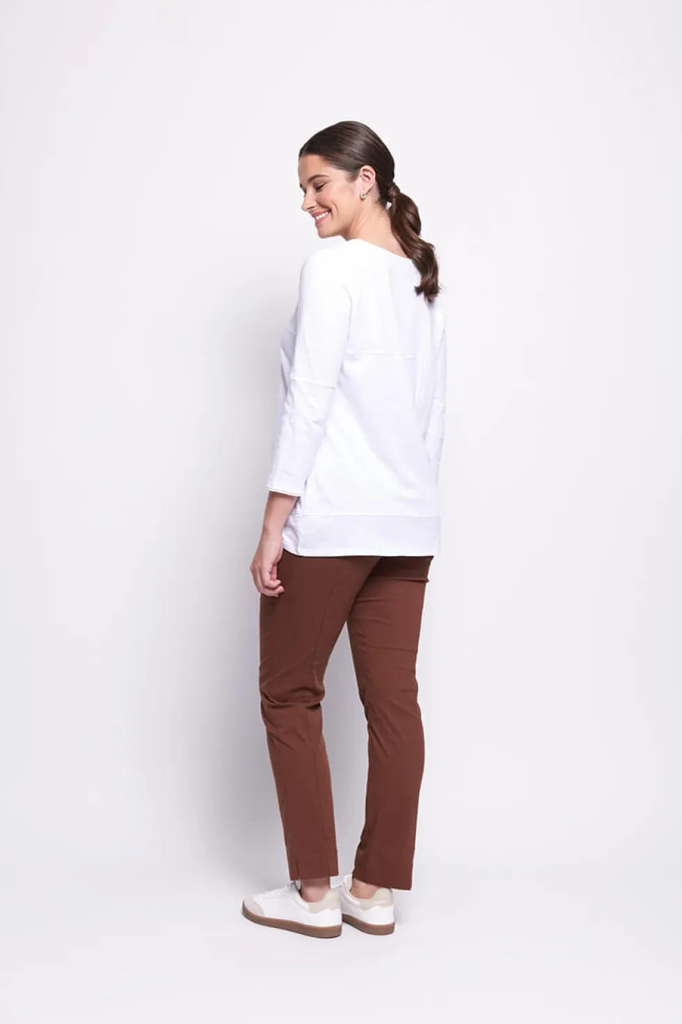 Long Slim Trapeze Pant – Sepia by Foil at The Wardrobe 69% Cotton, 27% Nylon, 4% Elastene Elastic waist band and pull on. Lovely light fabric. Machine Washable . Do Not Dryclean