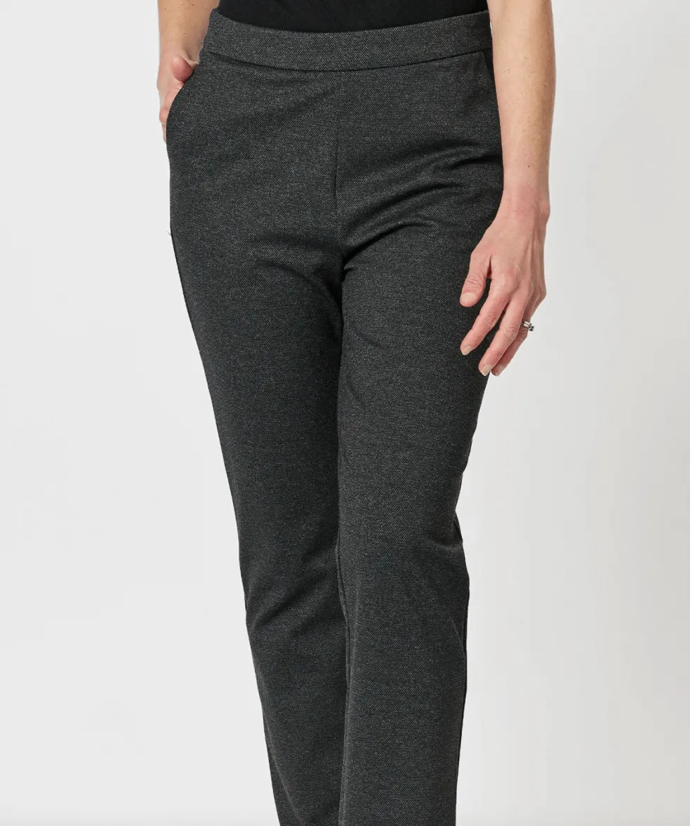 36544 – Textured Ponte Pant – Charcoal by Gordon Smith At The WardrobeFeatures: 62% Viscose / 32% Polyamide / 6% Elastane No fasteners Exposed elastic waistband detail on the back Side pockets Full length Pull on style Fit Guide: Straight leg style