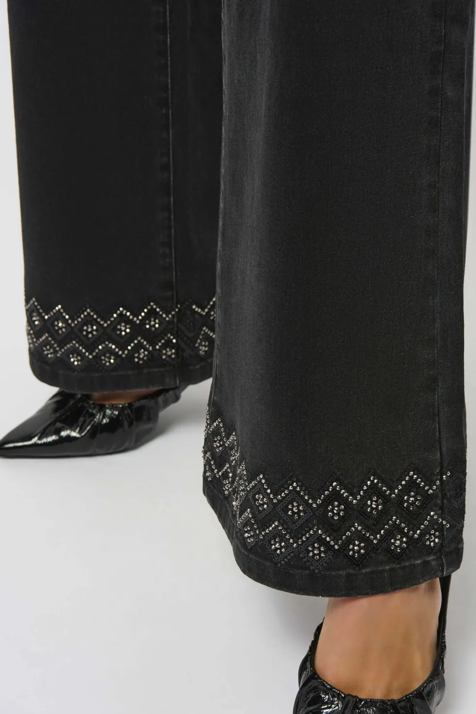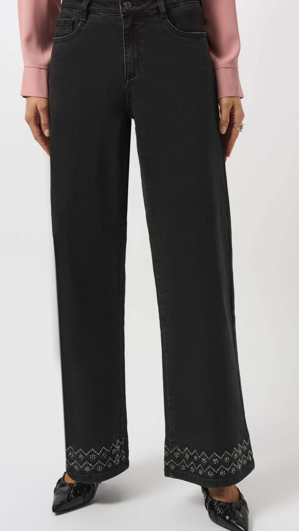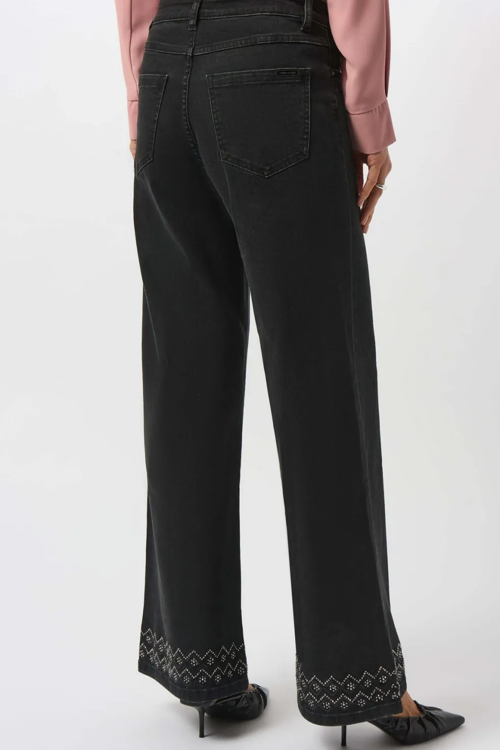Classic Wide Leg Stretch Denim Jeans – Charcoal Grey 253988 by Joseph Ribkoff at The Wardrobe What do you get when you combine Repreve® stretch denim with a timeless wide-leg silhouette and a five-pocket style? The ultimate everyday essential. These chic jeans feature eye-catching zigzag embroidery at the hem, adding a