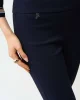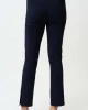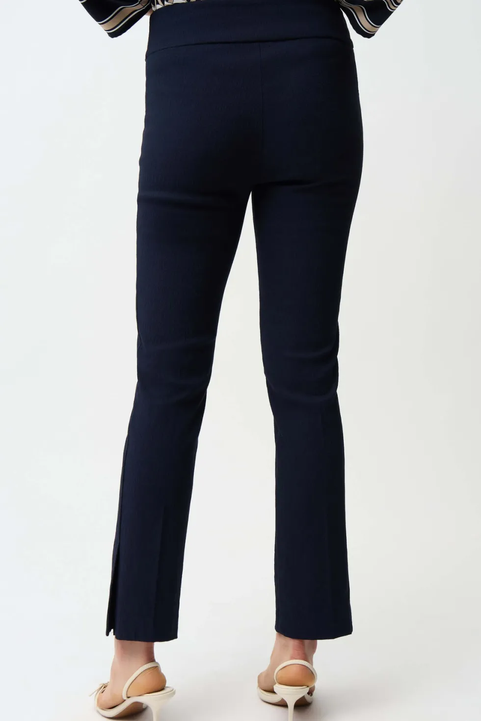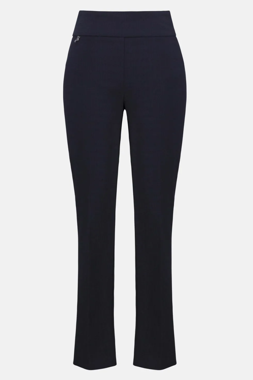 Blue Horizon Jacquard Straight Pull On Pants – Navy 261148 By Joseph Ribkoff at The Wardrobe. 22% Nylon, 4% Spandex, 74% Viscose rayon Jacquard woven fabric Structured contour waistband Side vents at leg and JR ornament at front waist Unlined Do not iron Hand wash in cold water with like colors Hang to dry in the shade