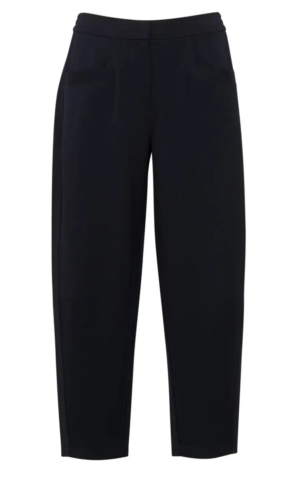Bethany Pant – Indigo LS2668 by Loobies Story at The Wardrobe Relaxed pant with a fly front with a hidden hook closure with front pockets and functional back pockets, and an elasticated back waist band. Featuring darts at the hem to create a tapered shape . Gentle cold machine wash with like colours using mild detergen
