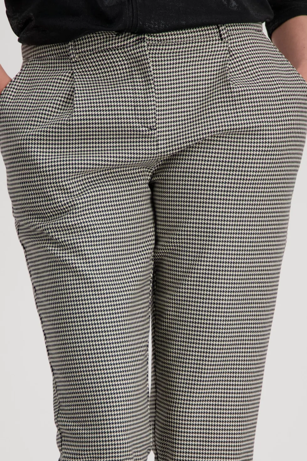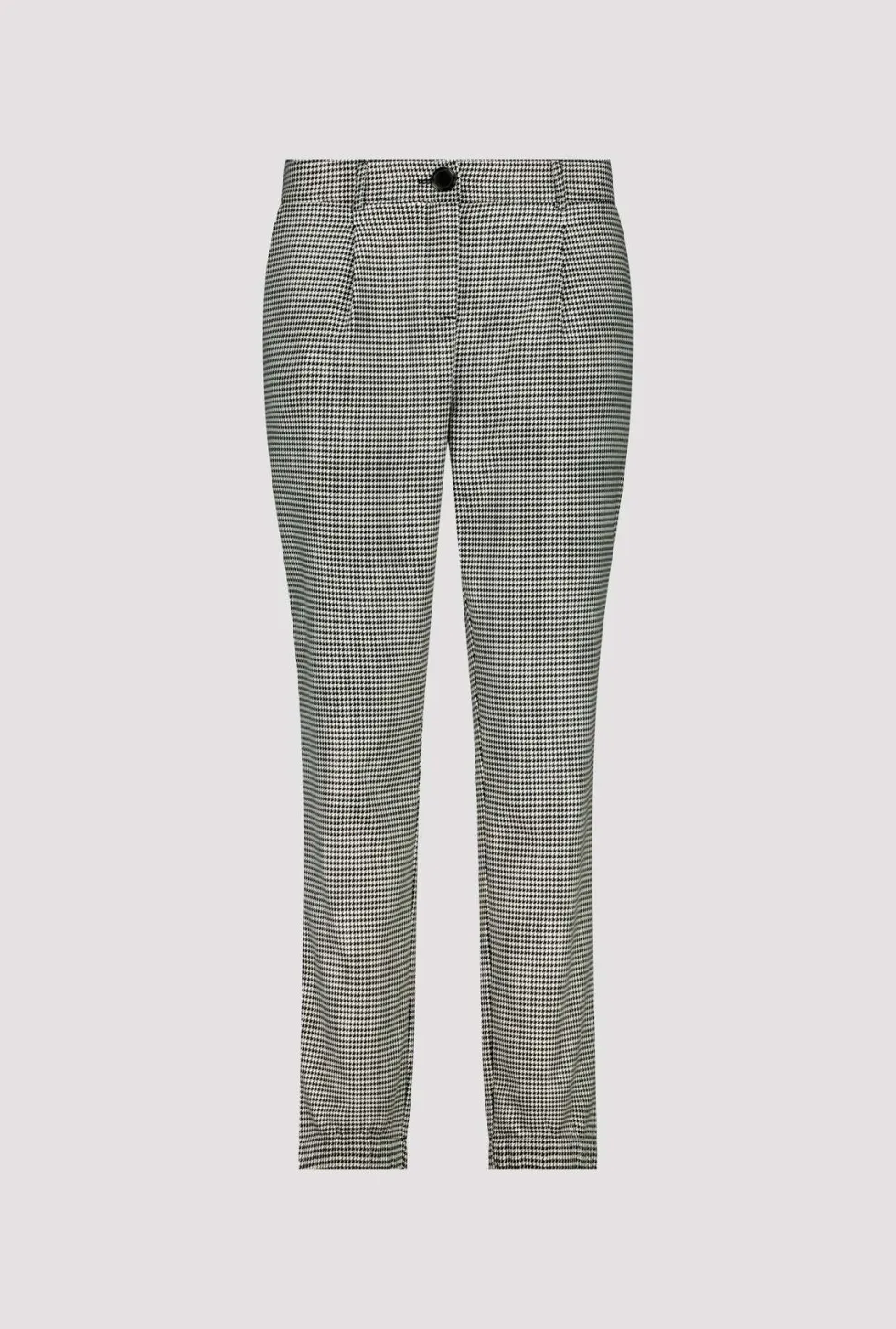Schwarz Business Trouser – Houndstooth 807815 by Monari at The Wardrobe. 64% polyester; 34% viscose; 2%Elastane These elegant houndstooth trousers are perfect for the business look and also have practical pockets. Viscose blend; Elastic material; Houndstooth; In-seam pockets; Fake back pockets; Hem with concealed, elas