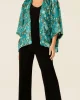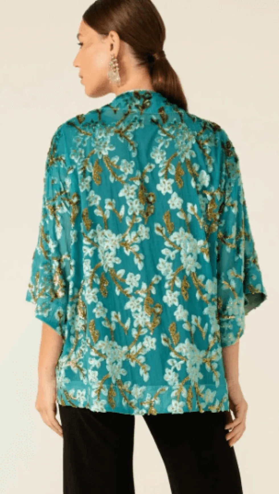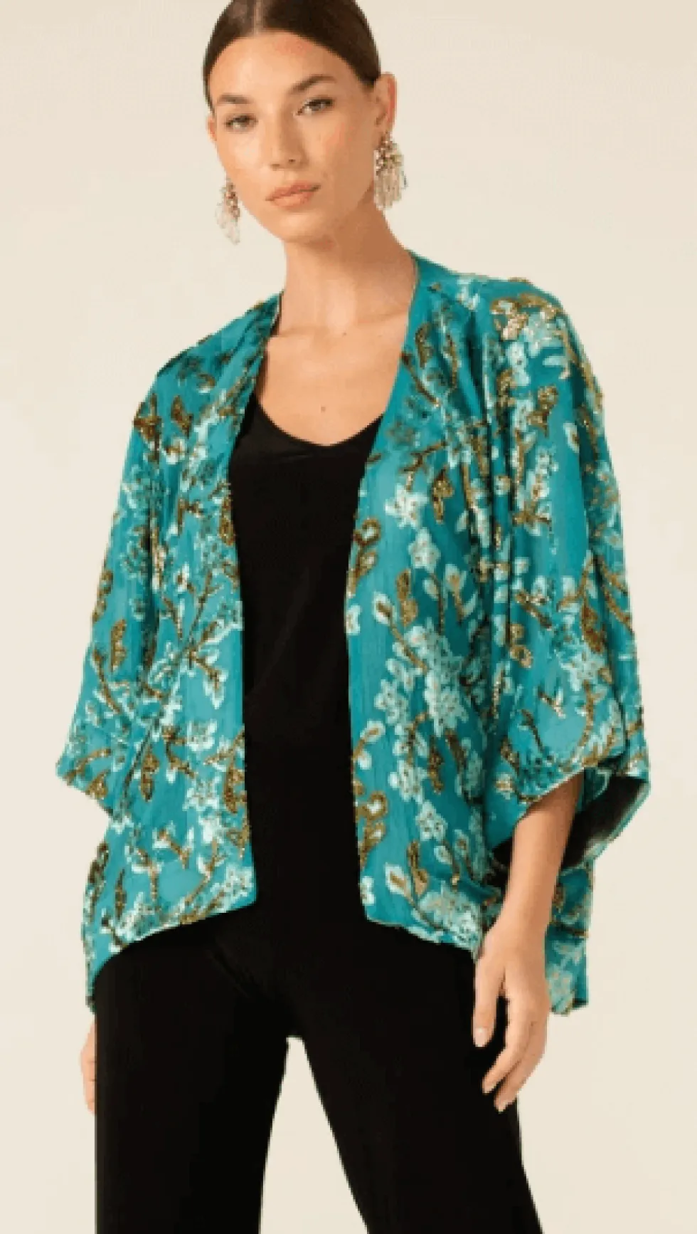 Blossom Kimono In Turquoise by Sacha Drake at The Wardrobe The Blossom Kimonois a versatile layering piece, crafted from a luxurious lightweight textured fabric with raised detailing for a touch of elegance. With an open front and 3/4 kimono sleeves, it’s the perfect addition to dresses, skirts, and pants for special