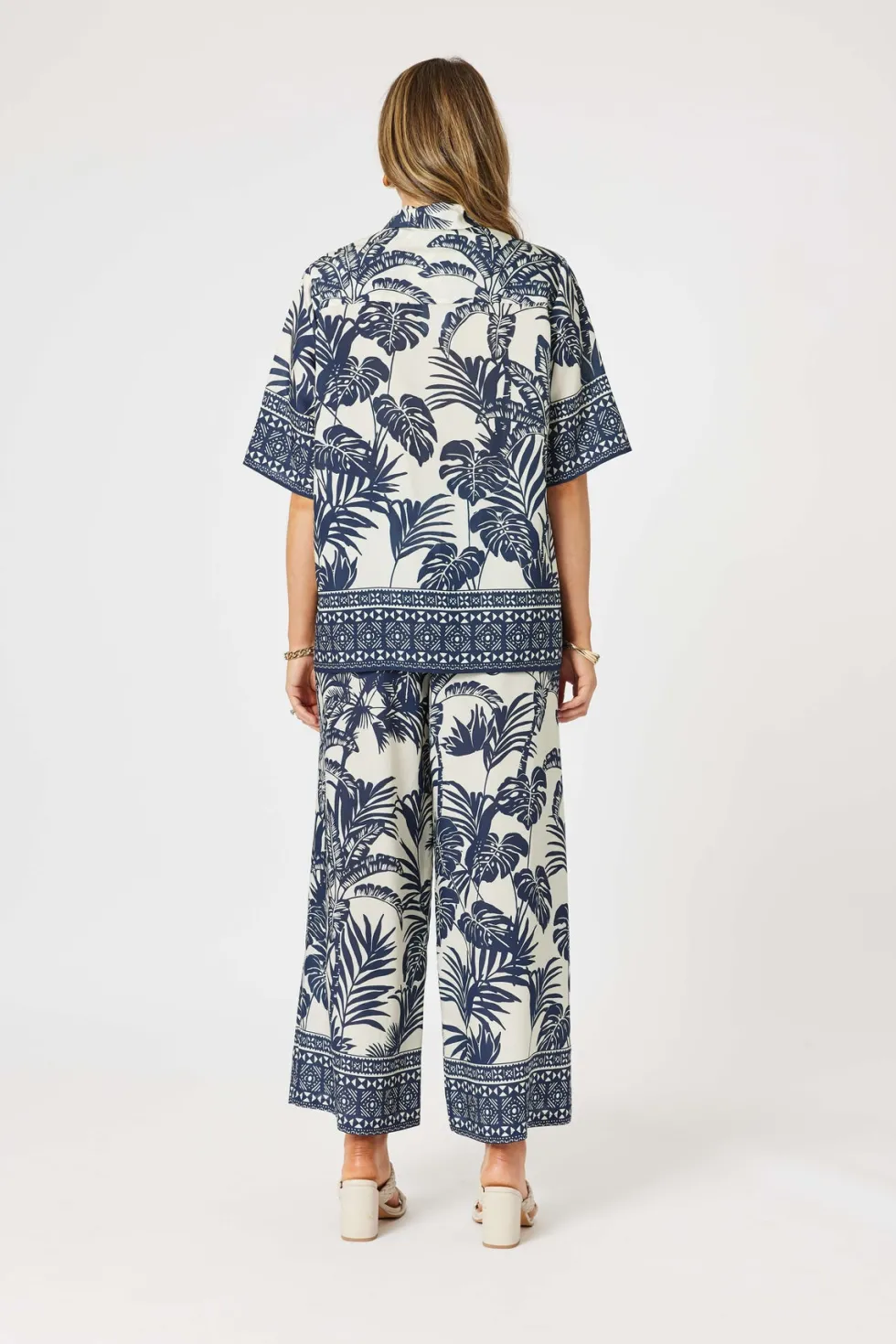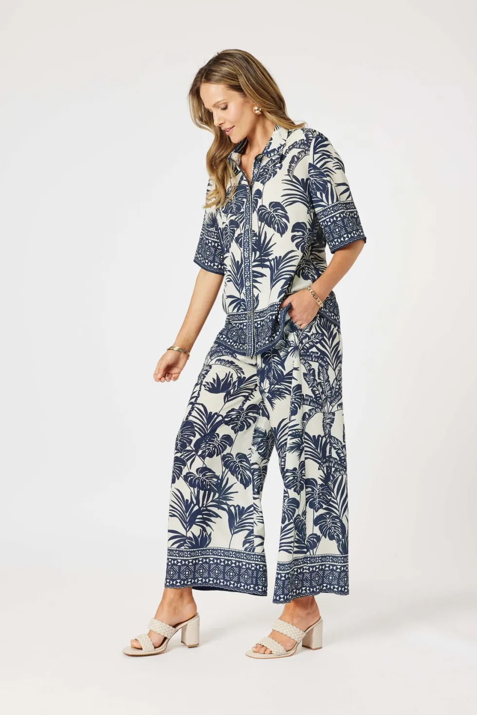 Palm Cove Shirt – Navy Multi 48161 by Hammock & Vine at The Wardrobe. Features: Effortless and versatile, the Palm Cove Shirt is your go-to for relaxed sophistication. Showcasing a striking navy and ivory tropical palm print, this button-front shirt features a collared neckline, short sleeves, and a breezy fit for