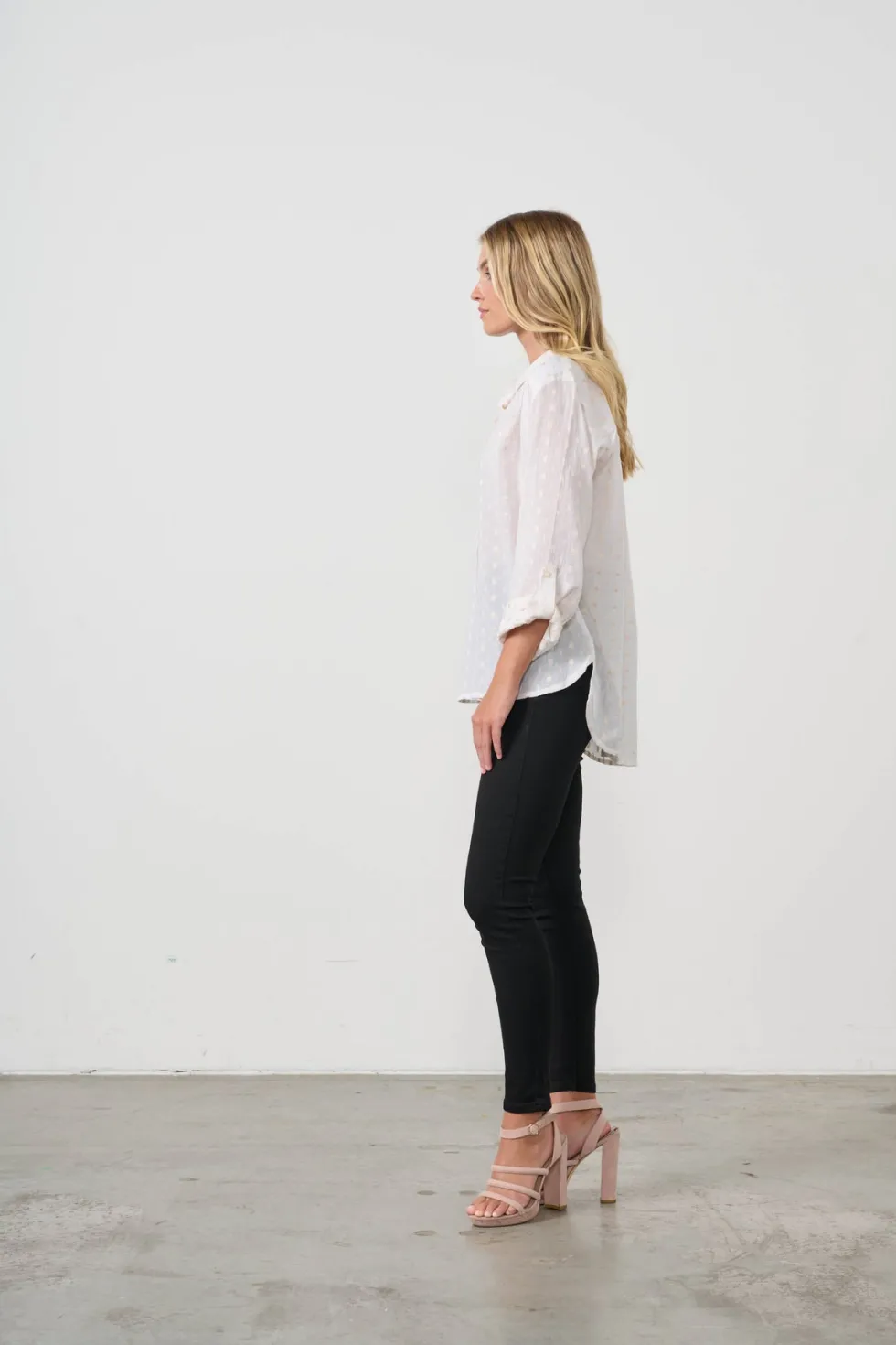 Jacquard Lurex Spot Shirt HF2661 by Holmes and Fallon at The Wardrobe. 100% Cotton Delicate lurex spots Relaxedfit Roll up sleeve with tab and button Hi-low hem Unlined This garment has no stretch Fully button through