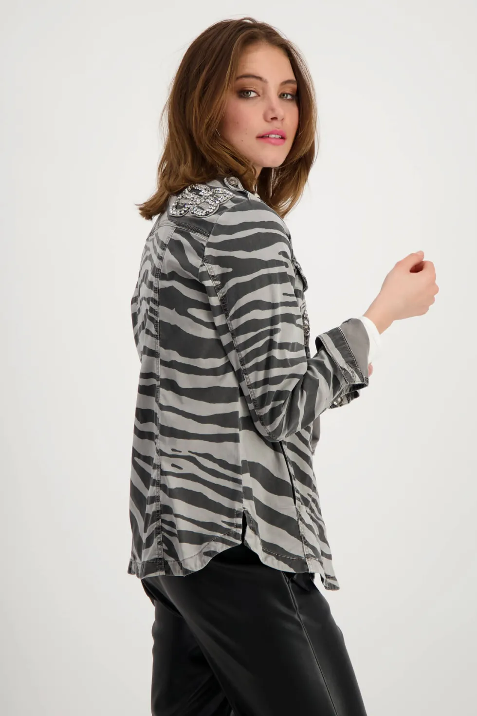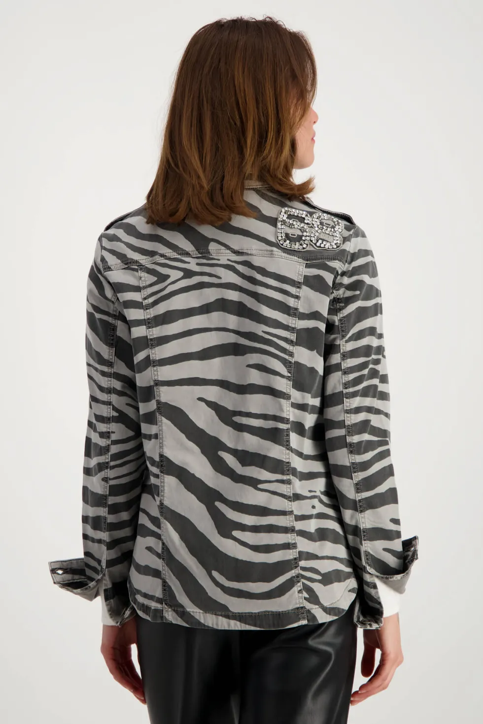 Shirt Collar Jacket – Steel – 807860 60% lyocell; 37% cotton; 3% elastane Lyocell mixture; Elastic material; All-over zebra pattern; Antique garment dyed.Patches; Embellishment; Regular fit; Shirt collar; Long sleeves with cuffs andpatent fasteners; Patch flap pocket; Shoulder tabs with button; Extended front The shi