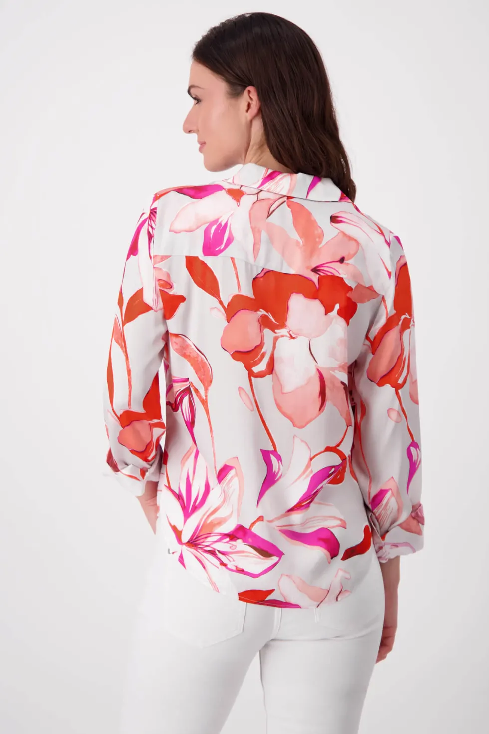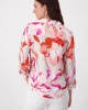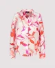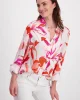 Palm Flower Print Shirt 408533 by Monari at The Wardrobe. 100% Viscose Elegant satin blouse made of light, flowing fabric. It has a floral design and a shirt collar.