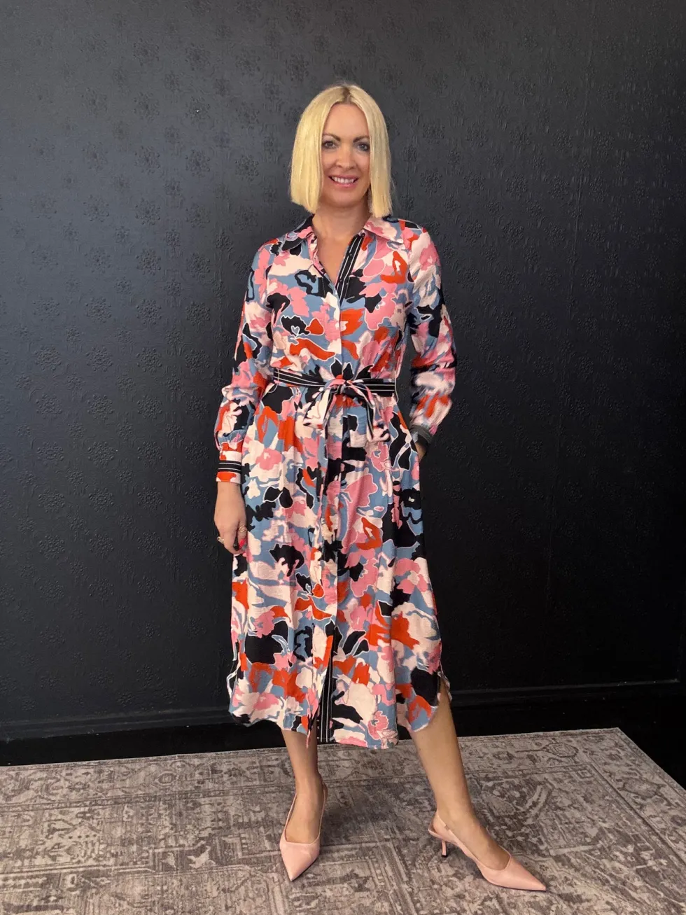 On The Shirt Dress – Neopolitan FO8105 by Foil at The Wardrobe. Belted button up maxi shirt dress with tie waist. Main: 85% Viscose, 15% NylonTape Trim: 97% Polyester, 3% Elastane Cold machine wash seperatley.