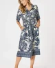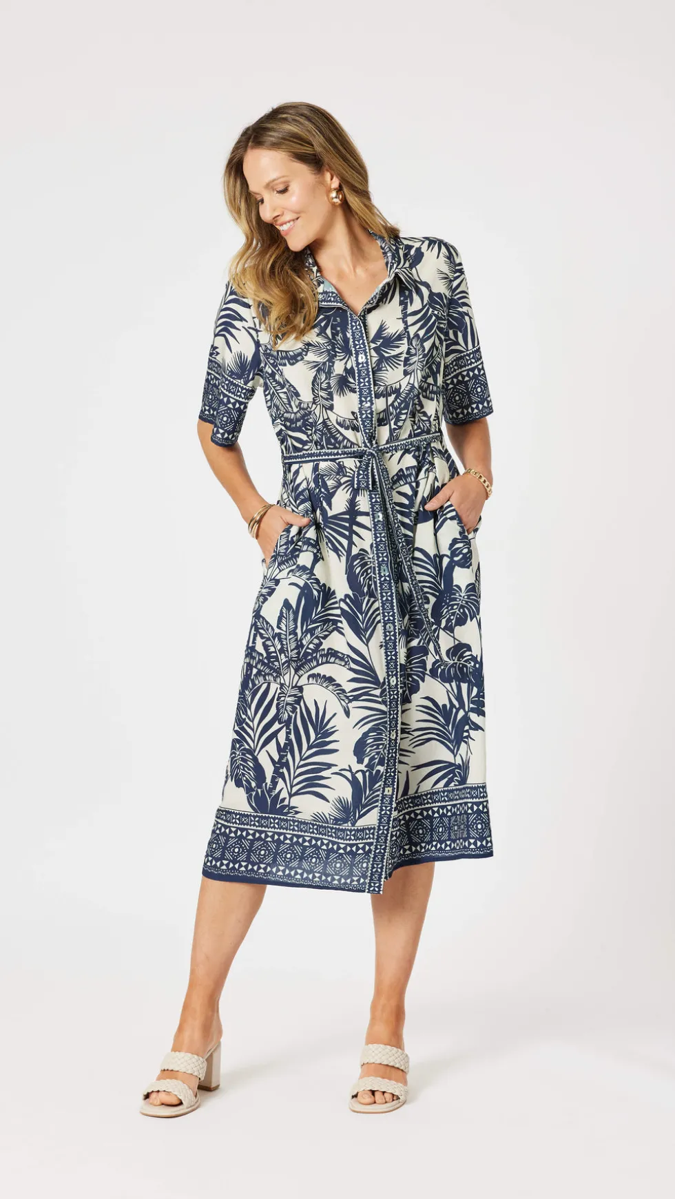 Palm Cove Dress – Navy Multi 48251 by Hammock & Vine at The Wardrobe Features: A versatile wardrobe essential, the Palm Cove Dress can be worn buttoned up for a chic, polished look or styled open as a breezy duster. Featuring a tropical palm print in a classic navy and ivory palette, this midi-length dress has shor