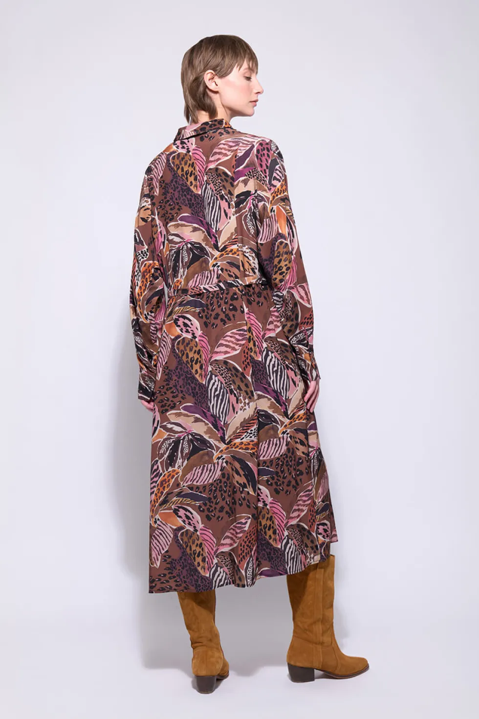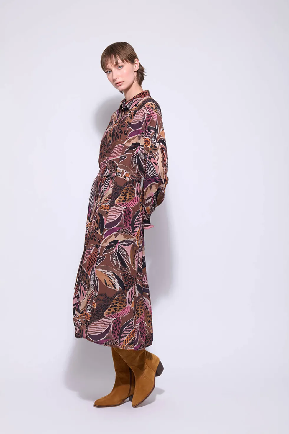 The Nala Dress 2752 by Neris at The Wardrobe, an elegant maxi-length dress designed for both comfort and style. Featuring a tie waist for a flattering fit, a classic collar, cuffed sleeves, and a concealed button-up front placket finish. Perfect for workwear or evening occasions. Designed in Christchurch, New Zealand.