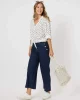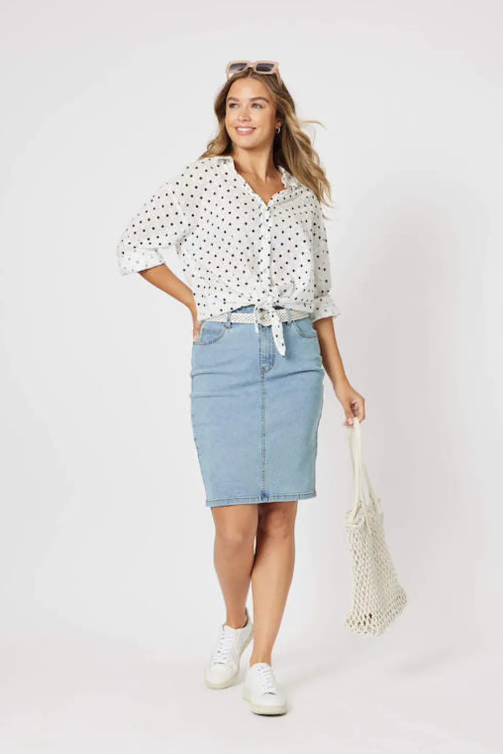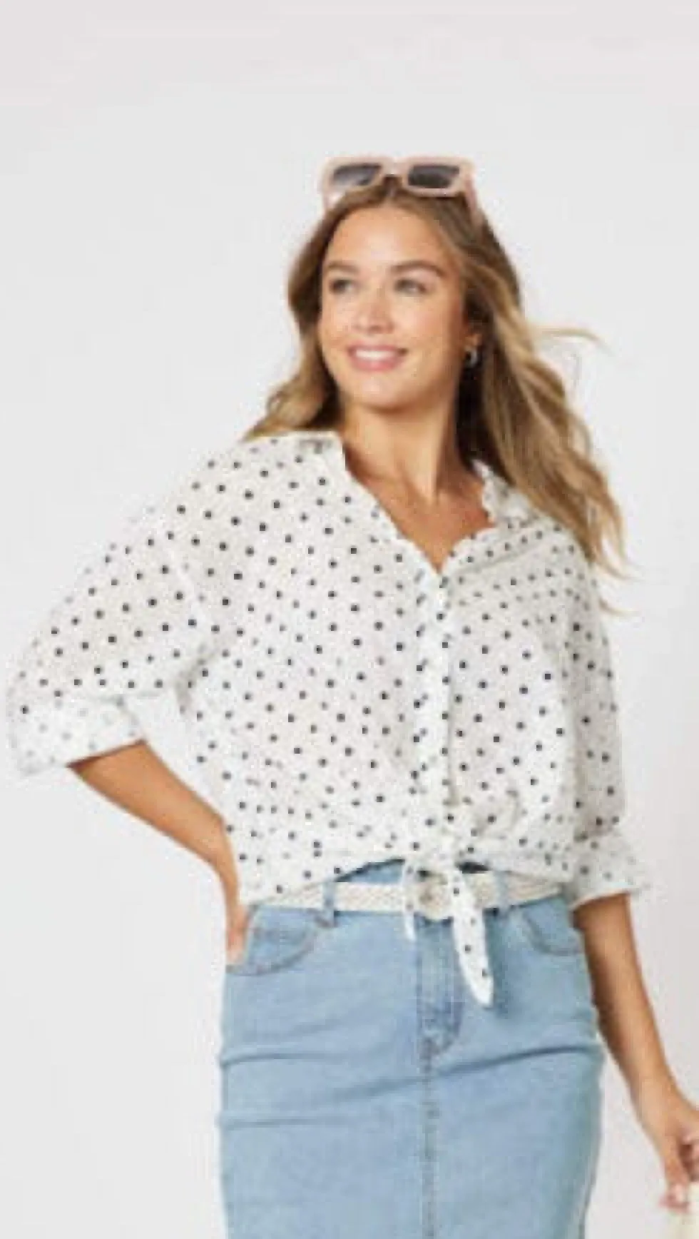 43603 – Byron Front Lace Trim Shirt Navy Features: 100% Cotton Tie front Spot design Button up Fit Guide: Long sleeve V neck Relaxed fit Hi lo fit